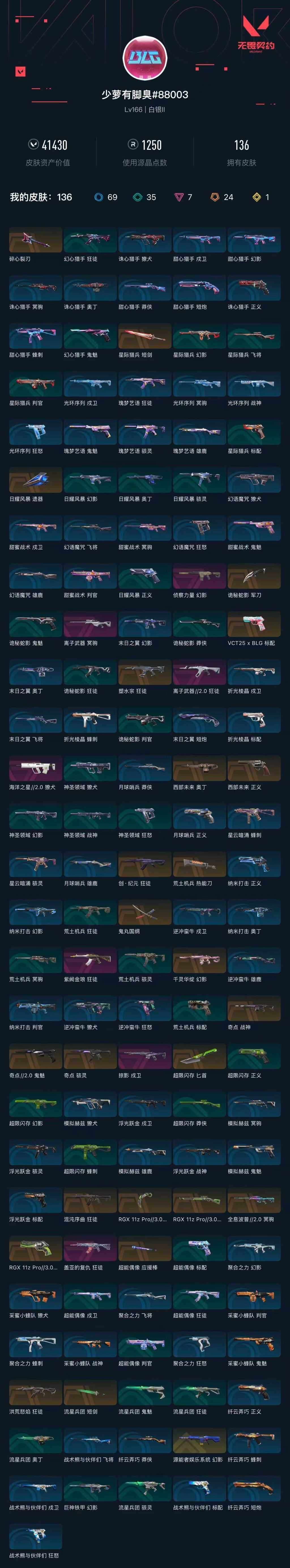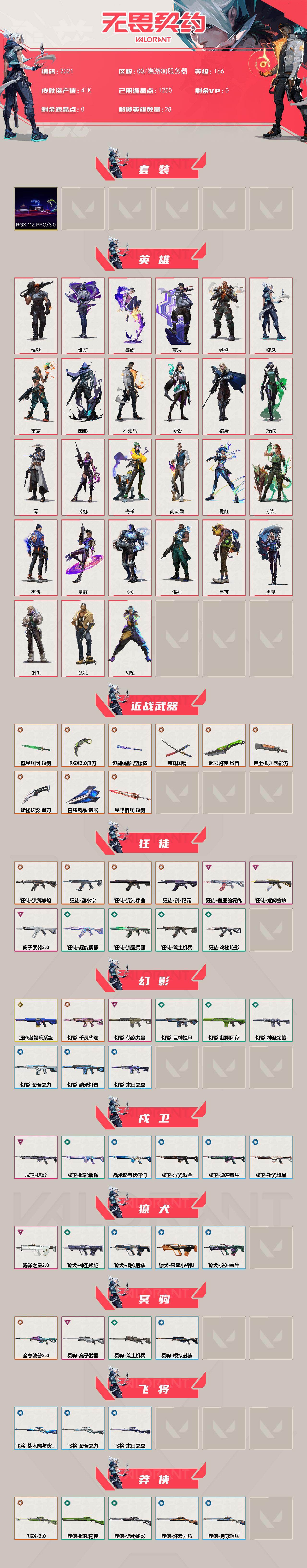 [16232200]【套装】:rgx 11z pro//3.0套装 【英雄】:幻棱,炼狱,维斯,暮蝶,钛狐,壹决,铁臂,捷风,雷兹,幽影,不死鸟,贤者,猎枭,蝰蛇,零,芮娜,奇乐,尚勃勒,霓虹,斯凯,夜露,星礈,k/o,海神,盖可,黑梦,钢锁 【近战武器】:近战武器-rgx 11z pro//3.0 爪刀,近战武器-鬼丸国纲,近战武器-流星兵团 短剑,近战武器-超能偶像 应援棒,近战武器-超限闪存 匕首,近战武器-荒土机兵 热能刀,近战武器-诡秘蛇影 军刀,近战武器-日耀风暴 遗器,近战武器-星际猎兵 短剑 【狂徒】:狂徒-洪荒怒焰,狂徒-混沌序曲,狂徒-塑水宗,狂徒-创·纪元,狂徒-盖亚的复仇,狂徒-紫阙金琅,狂徒-离子武器//2.0,狂徒-超能偶像,狂徒-荒土机兵,狂徒-流星兵团,狂徒-诡秘蛇影 【幻影】:幻影-源能者娱乐系统,幻影-千灵华绽,幻影-侦察力量,幻影-超限闪存,幻影-巨神铁甲,幻影-神圣领域,幻影-聚合之力,幻影-纳米打击,幻影-末日之翼 【戍卫】:戍卫-掠影,戍卫-超能偶像,戍卫-浮光跃金,戍卫-逆冲蛮牛,戍卫-战术熊与伙伴们,戍卫-折光棱晶 【獠犬】:獠犬-海洋之星//2.0,獠犬-神圣领域,獠犬-采蜜小蜂队,獠犬-模拟赫兹,獠犬-逆冲蛮牛 【冥驹】:冥驹-全息波普//2.0,冥驹-离子武器,冥驹-荒土机兵,冥驹-模拟赫兹 【飞将】:飞将-聚合之力,飞将-战术熊与伙伴们,飞将-末日之翼 【莽侠】:莽侠-rgx 11z pro//3.0,莽侠-超限闪存,莽侠-诡秘蛇影,莽侠-纤云弄巧,莽侠-月球哨兵 【战神】:战神-奇点,战神-神圣领域,战神-采蜜小蜂队,战神-浮光跃金 【奥丁】:奥丁-西部未来,奥丁-流星兵团,奥丁-纳米打击,奥丁-末日之翼 【判官】:判官-超能偶像,判官-诡秘蛇影,判官-采蜜小蜂队,判官-纳米打击x 【雄鹿】:雄鹿-模拟赫兹,雄鹿-逆冲蛮牛,雄鹿-月球哨兵 【骇灵】:骇灵-奇点,骇灵-荒土机兵,骇灵-流星兵团,骇灵-浮光跃金,骇灵-星云暗涌 【蜂刺】:蜂刺-超限闪存,蜂刺-聚合之力,蜂刺-纤云弄巧,蜂刺-星云暗涌,蜂刺-折光棱晶 【标配】:标配-超能偶像,标配-荒土机兵,标配-浮光跃金,标配-战术熊与伙伴们,标配-折光棱晶 【vct手呛】:标配-vct25 x blg 【正义】:正义-rgx 11z pro//3.0,正义-西部未来,正义-超限