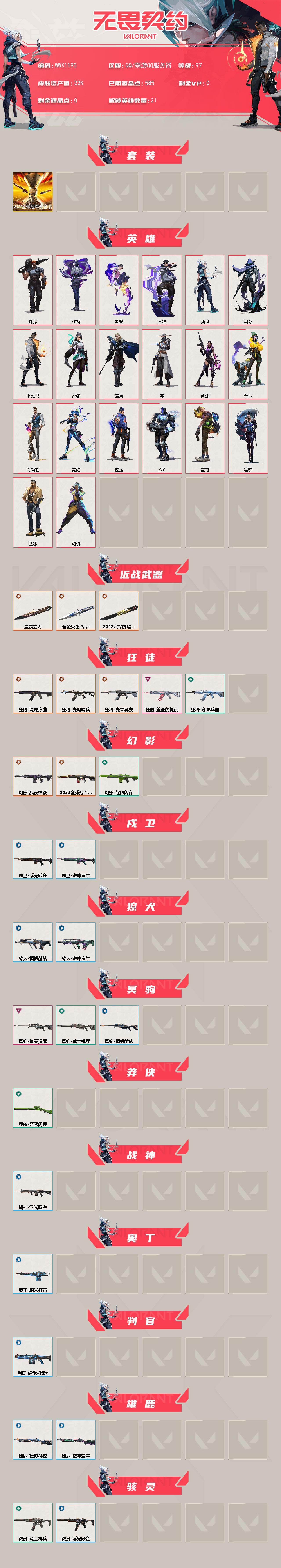 【wwx1195】终极8/卓越4/皮肤38/等级97/段位:青铜/2022全球冠军赛套装/幻棱/炼狱/维斯/暮蝶/钛狐/壹决/捷风/幽影/不死鸟/贤者/猎枭/零/芮娜/奇乐/尚勃勒/霓虹/夜露/k/o/盖可/黑梦/近战武器-2022全球冠军赛 蝴蝶刀/近战武器-威龙之刃/近战武器-合金突袭 军刀/狂徒-光明哨兵/狂徒-混沌序曲/狂徒-光荣异象/狂徒-盖亚的复仇/狂徒-寒冬兵器/幻影-2022全球冠军赛/幻影-黯夜怪谈/幻影-超限闪存/戍卫-浮光跃金/戍卫-逆冲蛮牛/獠犬-模拟赫兹/獠犬-逆冲蛮牛/冥驹-堕天遗武/冥驹-荒土机兵/冥驹-模拟赫兹/莽侠-超限闪存/战神-浮光跃金/奥丁-纳米打击/判官-纳米打击x/雄鹿-模拟赫兹/雄鹿-逆冲蛮牛/骇灵-荒土机兵/骇灵-浮光跃金/蜂刺-超限闪存/标配-超能偶像/标配-荒土机兵/标配-浮光跃金/正义-掠影/鬼魅-耀鳞威龙/鬼魅-模拟赫兹/狂怒-逆冲蛮牛/纳米打击 卡面/抑制技术 卡面/激斗汉堡 卡面/瓦娃脸雪糕 p2 卡面/荒土机兵 卡面/银弹猎手 卡面/精灵大战 卡面/南瓜盛典 卡面/钢弓与箭弦 卡面/排除故障 卡面/战术桌游 卡面/悠享食光 卡面/修车达人 卡面/模拟赫兹 卡面/浮光跃金 卡面/超限闪存 卡面/维斯工牌 卡面/正义的化身 卡面/终章:生意人麦宝 卡面/铁之华 卡面/时间到 卡面/最高舞台 卡面/声感陷阱设计图 卡面/梦幻奶茶 卡面/零点嗅探设计图 卡面/清除名单 卡面/无畏契约go!第一卷:零 卡面/铁臂设计图 卡面/代号红色 卡面/新兵报到 卡面/v契约 卡面/无畏契约 卡面/请求重启 喷漆/逆冲蛮牛 喷漆/纳米打击 喷漆/鼻尖上的蝴蝶 喷漆/简笔画黯兽 喷漆/独守蝰腹 喷漆/他们将落荒而逃 喷漆/通缉:战术企鹅 喷漆/荒土机兵 喷漆/别挡我吃球! 喷漆/控场勿近 喷漆/皮蛋呼呼 喷漆/像素星礈 喷漆/图谋不轨的零 喷漆/小丑猫 喷漆/模拟赫兹 喷漆/高丽风情小熊 喷漆/蹲到一个 喷漆/全力集中 喷漆/超限闪存 喷漆/rua一下 喷漆/熊抱 喷漆/高丽风情小虎 喷漆/记在小本本 喷漆/防弹企鹅 喷漆/高丽风情小蛙 喷漆/超级粉丝 喷漆/捷风差距 喷漆/惊声尖叫 喷漆/拼一呛 喷漆/我的刀呢? 喷漆/新潮流 喷漆/买装还是存钱 喷漆/胜利属于无畏契约 喷漆/glhf 喷漆/无畏契约 喷漆/猫猫木乃伊 挂饰/水壶 挂饰/纳米打击 挂饰/逆冲蛮牛 挂饰/可爱糖糖 挂饰/伞绳 挂饰/第九季//第三幕 纪念币 挂饰/拳击战术熊 挂饰/工具腰带 挂饰/暗藏猫腻 挂饰/高丽风情 挂饰/熔岩灯 挂饰/超限闪存 挂饰/迷你k/o 挂饰/模拟赫兹 挂饰/第九季//第二幕 纪念币 挂饰/终章:这瓜保熟 挂饰/糖葫芦 挂饰/袖珍捷风 挂饰/迷你浓缩 挂饰/第九季//第一幕 纪念币 挂饰/第八季//第三幕 纪念币 挂饰/《双城之战》魄罗 挂饰/无畏契约 纪念币 挂饰
