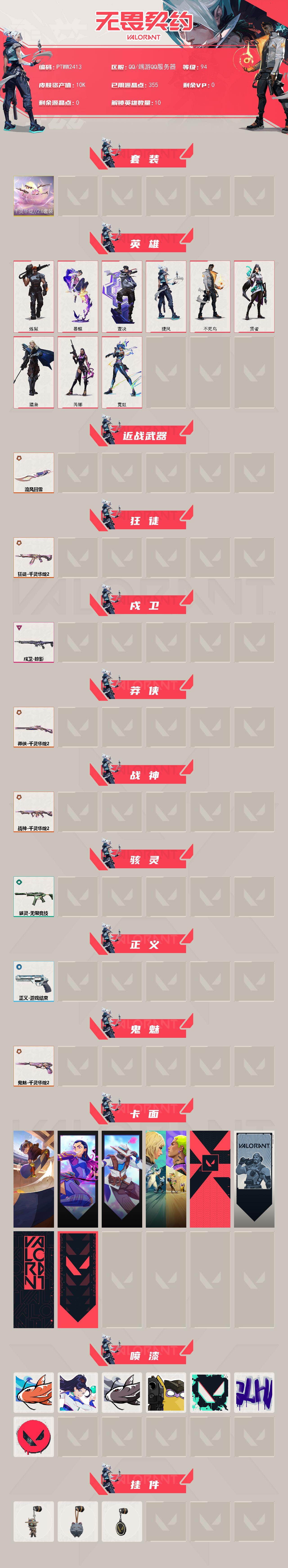 【ptww2413】终极6/卓越1/皮肤20/等级94/段位:青铜/千灵华绽//2.0套装/炼狱/暮蝶/壹决/捷风/不死鸟/贤者/猎枭/芮娜/霓虹/近战武器-流风回雪/狂徒-千灵华绽//2.0/掠影-戍卫/莽侠-千灵华绽//2.0/战神-千灵华绽//2.0/骇灵-无限竞技/正义-游戏结束/鬼魅-千灵华绽//2.0/clutch 卡面/无畏契约go!第一卷:芮娜 卡面/无畏契约go!第一