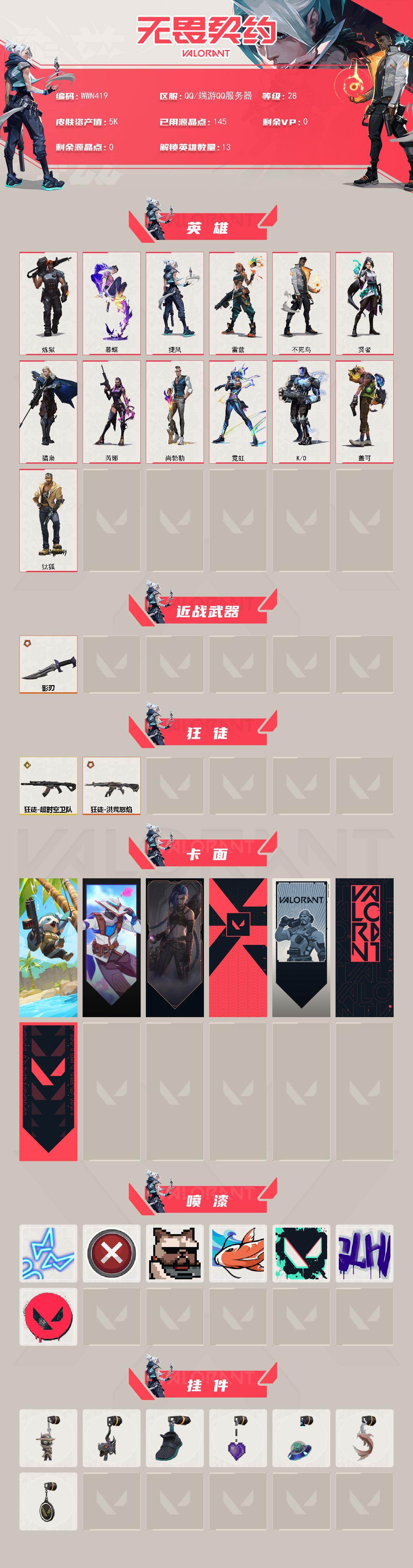 【wwn419】终极2/传奇1/皮肤3/等级28/段位:白银/炼狱/暮蝶/钛狐/捷风/雷兹/不死鸟/贤者/猎枭/芮娜/尚勃勒/霓虹/k/o/盖可/影刃/狂徒-超时空卫队/洪荒怒焰-狂徒/树懒大作战 卡面/无畏契约go!第一卷:零 卡面/《双城之战》金克丝 卡面/代号红色 卡面/新兵报到 卡面/v契约 卡面/无畏契约 卡面/霓光四射 喷漆/买装还是存钱 喷漆/关门放狗 喷漆/红鳞 喷漆/