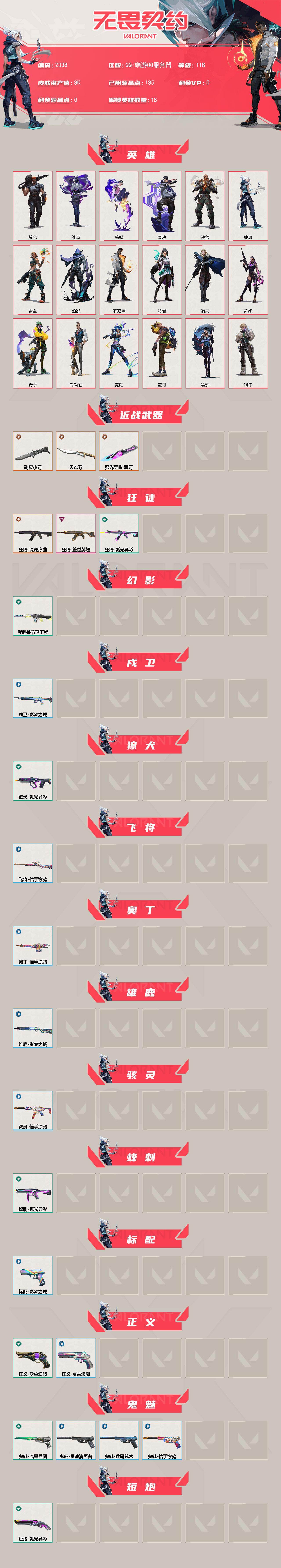 [16267109]【英雄】:炼狱,维斯,暮蝶,壹决,铁臂,捷风,雷兹,幽影,不死鸟,贤者,猎枭,芮娜,奇乐,尚勃勒,霓虹,盖可,黑梦,钢锁 【近战武器】:近战武器-剥皮小刀,近战武器-弧光异彩 军刀,近战武器-天玄刀 【狂徒】:狂徒-混沌序曲,狂徒-盖世英雄,狂徒-弧光异彩 【幻影】:幻影-噬源兽防卫工程 【戍卫】:戍卫-彩梦之城 【獠犬】:獠犬-弧光异彩 【飞将】:飞将-信手涂鸦 【奥丁】:奥丁-信手涂鸦 【雄鹿】:雄鹿-彩梦之城 【骇灵】:骇灵-信手涂鸦 【蜂刺】:蜂刺-弧光异彩 【标配】:标配-彩梦之城 【正义】:正义-沙尘幻旅,正义-复古浪潮 【鬼魅】:鬼魅-流星兵团,鬼魅-灵魂消声者,鬼魅-数码咒术,鬼魅-信手涂鸦 【短炮】:短炮-弧光异彩 【卡面】:《双城之战》拥抱 卡面,精灵大战 卡面,欢迎来到底城 卡面,南瓜盛典 卡面,vct cn首冠 卡面,无畏契约:暮蝶 卡面,修车达人 卡面,正义的化身 卡面,最高舞台 卡面,声感陷阱设计图 卡面,梦幻奶茶 卡面,趁热吃 卡面,源能反应 卡面,零点嗅探设计图 卡面,终章:瓦娃脸雪糕 卡面,表象之下 卡面,沙雕爆能器 卡面,无畏契约go!第一卷:芮娜 卡面,清除名单 卡面,无畏契约go!第一卷:零 卡面,龍记 卡面,《双城之战》金克丝 卡面,逆向独行 卡面 ,完美调谐 卡面 ,暗呛 卡面,无畏契约go!第一卷:贤者 卡面,终章:黑影先生的咖啡! 卡面,铁臂vs雷兹 卡面,钢锁vs盖可 卡面,别冒尖 卡面,夯实根基 卡面,"luie" 卡面,热烈欢迎 卡面,铁臂设计图 卡面,代号红色 卡面,冰淇淋店 卡面,新兵报到 卡面,友军火力 卡面,v契约 卡面,无畏契约 卡面,2023全球冠军赛 趴地跳跳车 卡面 【喷漆】:嘭! 喷漆,都算到了 喷漆,控场勿近 喷漆,伤心心 喷漆,小丑猫 喷漆,熊抱 喷漆,蛋糕还是爆能器? 喷漆,超级粉丝 喷漆,捷风差距 喷漆,2021冠军巡回赛花火 喷漆,拼一呛 喷漆,我觉得不行 喷漆,吸一口快乐 喷漆,我的刀呢? 喷漆,uwu 喷漆,新潮流 喷漆,双击点赞 喷漆,买装还是存钱 喷漆,醒狮贺春 喷漆,无畏契约go!第一卷:芮娜 喷漆,红鳞 喷漆,无畏契约go!第一卷:零 喷漆,无畏契约go!第一卷:捷风 喷漆,无畏契约go!第一卷:贤者 喷漆,暴走萝莉 喷漆,松叶 喷漆,无畏契约go!第一卷:奇乐 喷漆,旅