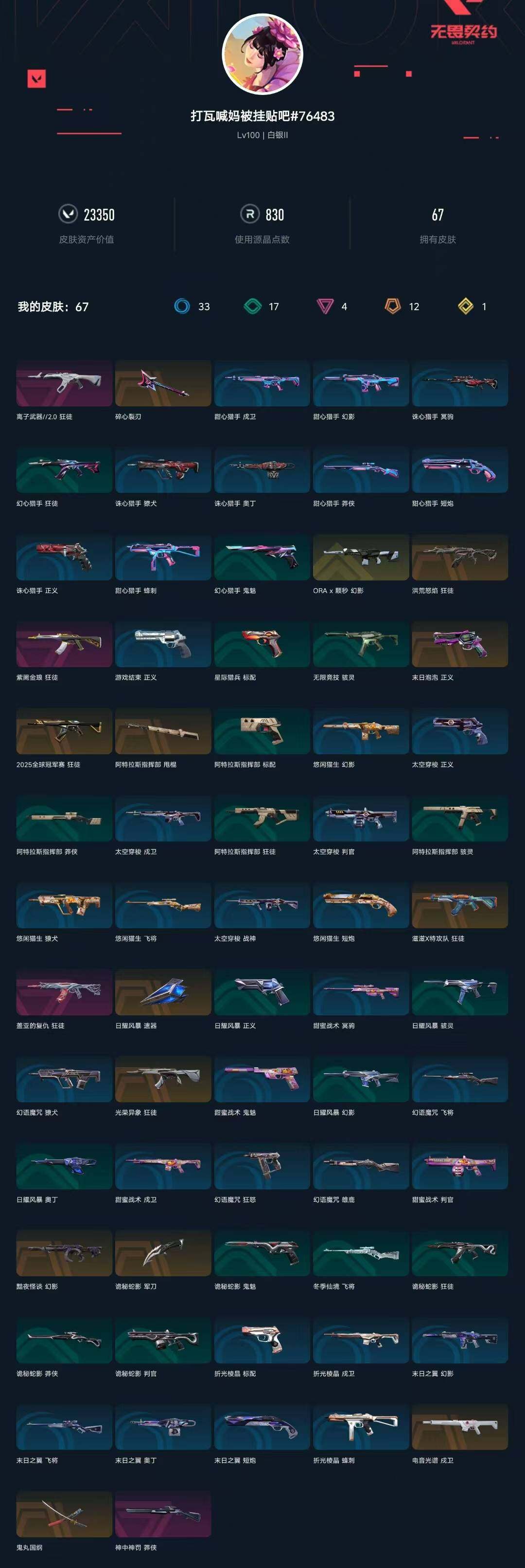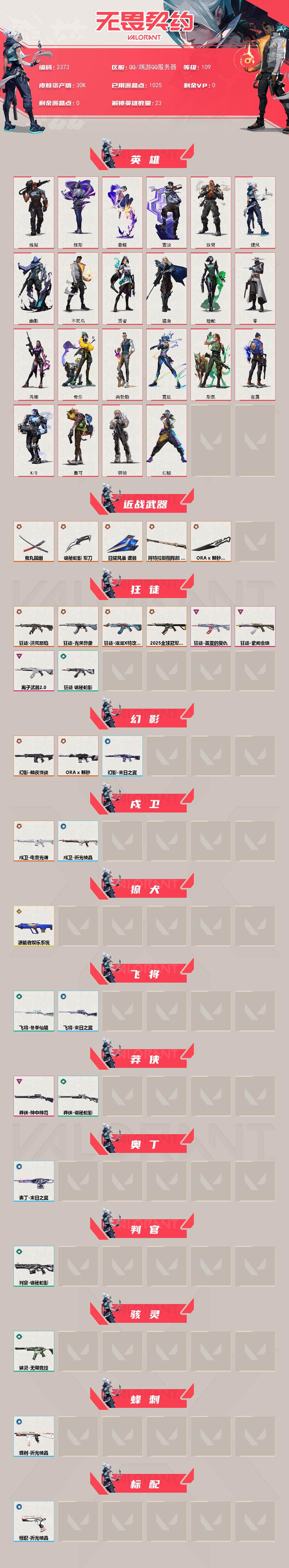 [16291686]【英雄】:幻棱,炼狱,维斯,暮蝶,壹决,铁臂,捷风,幽影,不死鸟,贤者,猎枭,蝰蛇,零,芮娜,奇乐,尚勃勒,霓虹,斯凯,夜露,k/o,盖可,钢锁 【近战武器】:近战武器-a x 颗秒 军刀,近战武器-鬼丸国纲,近战武器-诡秘蛇影 军刀,近战武器-日耀风暴 遗器,近战武器-阿特拉斯指挥部 甩棍 【狂徒】:狂徒-2025全球冠军赛,狂徒-洪荒怒焰,狂徒-光荣异象,狂徒-滋滋x特攻队,狂徒-盖亚的复仇,狂徒-紫阙金琅,狂徒-离子武器//2.0,狂徒-诡秘蛇影 【幻影】:幻影-黯夜怪谈,幻影-a x 颗秒,幻影-末日之翼 【戍卫】:戍卫-电音光谱,戍卫-折光棱晶,戍卫-电音光谱 【獠犬】:獠犬-源能者娱乐系统 【飞将】:飞将-冬季仙境,飞将-末日之翼 【莽侠】:莽侠-神中神罚,莽侠-诡秘蛇影 【奥丁】:奥丁-末日之翼 【判官】:判官-诡秘蛇影 【骇灵】:骇灵-无限竞技 【蜂刺】:蜂刺-折光棱晶 【标配】:标配-折光棱晶 【正义】:正义-末日泡泡,正义-游戏结束 【鬼魅】:鬼魅-诡秘蛇影 【短炮】:短炮-末日之翼 【卡面】:修车达人 卡面,正义的化身 卡面,零点嗅探设计图 卡面,无畏契约go!第一卷:芮娜 卡面,无畏契约go!第一卷:零 卡面,比比看谁快? 卡面,别冒尖 卡面,铁臂设计图 卡面,代号红色 卡面,新兵报到 卡面,v契约 卡面,无畏契约 卡面 【喷漆】:熊抱 喷漆,开心到爆炸 喷漆,买装还是存钱 喷漆,无畏契约go!第一卷:贤者 喷漆,胜利属于无畏契约 喷漆,glhf 喷漆,无畏契约 喷漆 【挂饰】:无畏契约go!第一卷 芮娜 挂饰,无畏契约go!第一卷 零 挂饰,第九季//第二幕 纪念币 挂饰,迷你机甲 挂饰,天外飞客 挂饰,好运福爪 挂饰,《双城之战》魄罗 挂饰,无畏契约 纪念币 挂饰