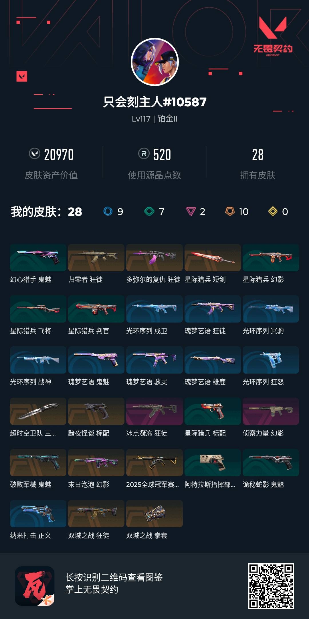 [16293494]【精品超时空卫队三棱军刺】l193429无畏契约/117级/铂金ii/20英雄/28皮肤/资产20970/已使用r点520/剩余r点30/2025全球冠军赛-狂徒,双城之战-狂徒,双城之战-拳套,超时空卫队-三棱军刺,星际猎兵-短剑,多弥尔的复仇-狂徒,末日泡泡-幻影,归零者-狂徒,侦察力量-幻影,冰点凝冻-狂徒,黯夜怪谈-标配,破败军械-鬼魅