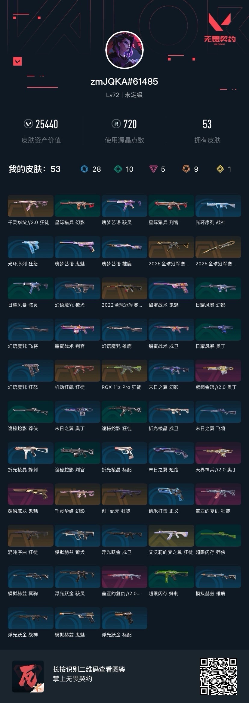 [16296556]9橙皮 1金皮 5紫皮 53皮肤 28英雄 72卡面 720已用源晶 未定级段位 【套装】2025全球冠军赛 【近战武器皮肤】2025全球冠军赛 蝴蝶刀 【佩呛皮肤】鬼魅-耀鳞威龙 【步呛皮肤】狂徒-创·纪元狂徒-千灵华绽//2.02025全球冠军赛 狂徒狂徒-rgx 11z pro狂徒-混沌序曲狂徒-艾沃莉的梦之翼狂徒-盖亚的复仇狂徒-机动狂飙幻影-千灵华绽 【机呛皮肤】奥丁-天界神兵2.0奥丁-紫阙金琅2.0战神-盖亚的复仇2.0 【挂饰】袖珍捷风挂饰神中神挂饰2025全球冠军赛挂饰v26第一幕纪念币 挂饰双城之战小蛋糕挂饰
