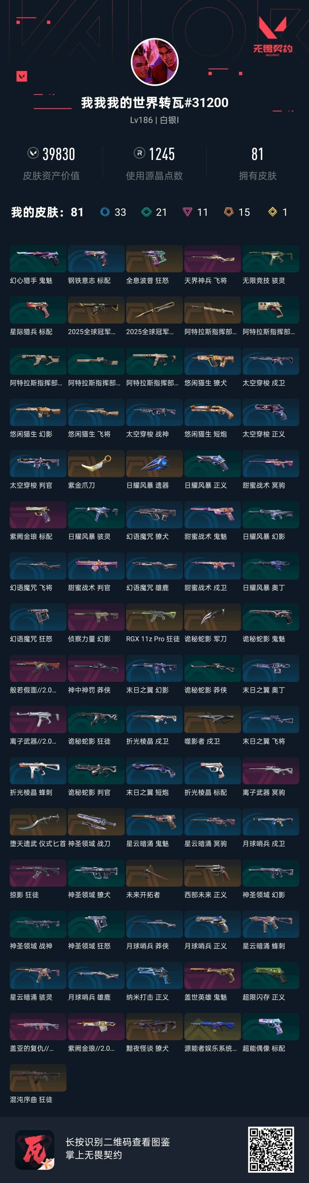 15橙皮 1金皮 11紫皮 81皮肤 28英雄 136卡面 1245已用源晶 白银段位 【套装】2025全球冠军赛 【近战武器皮肤】日耀风暴 遗器阿特拉斯指挥部诡秘蛇影未来开拓者神圣领域 战刀2025全球冠军赛 蝴蝶刀堕天遗武 仪式匕首紫金爪刀 【佩呛皮肤】正义-西部未来鬼魅-盖世