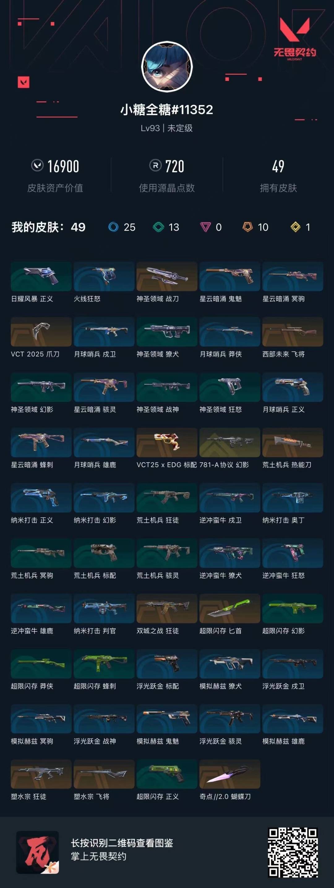 [16297789]10橙皮 1金皮 49皮肤 25英雄 87卡面 720已用源晶 未定级段位 【套装】vctcn2025套装vct 2025赛季礼包 【近战武器皮肤】匕首-超限闪存蝴蝶刀-奇点//2.0vct 2025 爪刀神圣领域 战刀荒土机兵热能刀 【佩呛皮肤】标配-vct25xedg 【步呛皮肤】狂徒-双城之战狂徒-塑水宗幻影-781-a协议 【狙击呛皮肤】飞将-西部未来飞将-塑水宗 【挂饰】vct2025太平洋联赛挂饰vct2025美洲联赛挂饰vct2025emea联赛挂饰神中神挂饰vct2025cn联赛挂饰双城之战小蛋糕挂饰终章ko小金人挂饰vctxedg挂饰