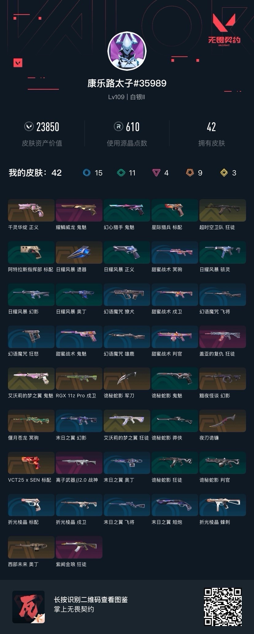 9橙皮 3金皮 4紫皮 42皮肤 19英雄 67卡面 610已用源晶 白银段位 【近战武器皮肤】夜刃诡镰日耀风暴 遗器诡秘蛇影 【佩呛皮肤】标配-vct25xsen正义-千灵华绽鬼魅-艾沃莉的梦之翼鬼魅-耀鳞威龙 【步呛皮肤】狂徒-超时空卫队戍卫-rgx 11z pro幻影-黯夜怪谈