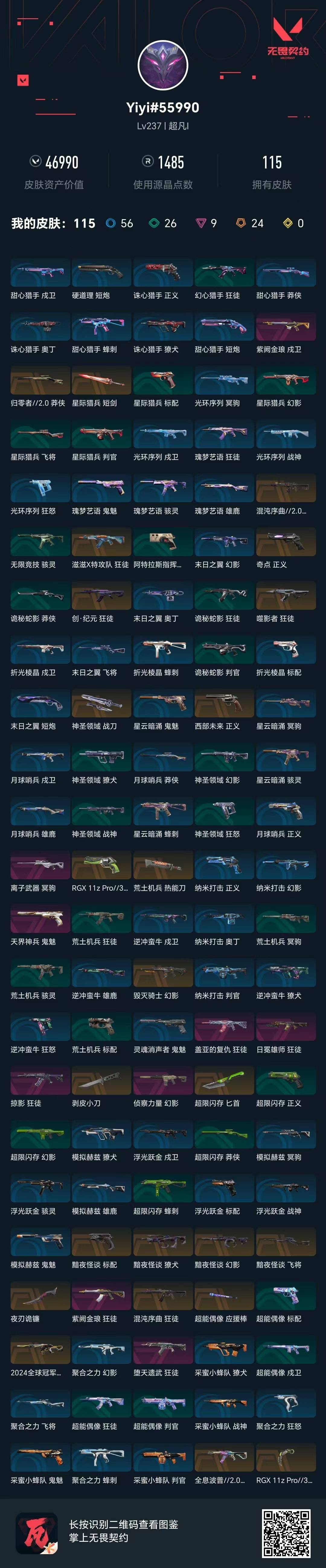 [16304615]24橙皮 9紫皮 115皮肤 28英雄 133卡面 1485已用源晶 超凡段位 【亮点皮肤】幻影-2024全球冠军赛 【套装】黯夜怪谈套装 【近战武器皮肤】匕首-超限闪存夜刃诡镰神圣领域 战刀荒土机兵热能刀星际猎兵 短剑剥皮小刀爪刀-rgx 11z pro 3.0超能偶像 应援棒 【佩呛皮肤】正义-西部未来标配-黯夜怪谈正义-奇点正义-rgx 11z pro 3.0鬼魅-天界神兵 【步呛皮肤】狂徒-噬影者狂徒-创·纪元幻影-毁灭骑士狂徒-掠影獠犬-黯夜怪谈幻影-混沌序曲2.0狂徒-滋滋x特攻队幻影-黯夜怪谈狂徒-混沌序曲狂徒-紫阙金琅狂徒-盖亚的复仇狂徒-全息波普//2.0狂徒-堕天遗武狂徒-日冕雄师幻影-侦察力量戍卫-紫阙金琅 【狙击呛皮肤】莽侠-归零者//2.0冥驹-离子武器飞将-黯夜怪谈 【挂饰】袖珍捷风挂饰超能偶像挂饰神中神挂饰v25第六幕:超凡 挂饰v26第一幕纪念币 挂饰第九季超凡挂饰v25第三幕神话挂饰糖葫芦挂饰双城之战小蛋糕挂饰终章ko小金人挂饰飞刀挂饰