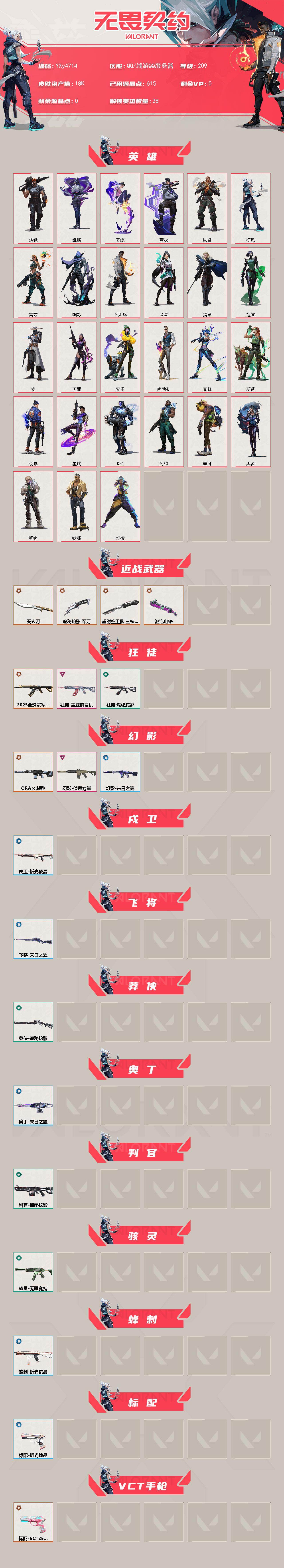 【1.8w库存三棱军刺.天玄刀.泡泡电锯.25冠军.盖亚.侦查.颗秒幻影】yxy4714【无二次】【因赛季更新游戏段付以上号为准!】 【英雄】:幻棱,炼狱,维斯,暮蝶,钛狐,壹决,铁臂,捷风,雷兹,幽影,不死鸟,贤者,猎枭,蝰蛇,零,芮娜,奇乐,尚勃勒,霓虹,斯凯,夜露,星礈,k/o,海神,盖可,黑梦,钢锁 【近战武器】:近战武器-泡泡电锯,近战武器-超时空卫队 三棱军刺,近战武器-天玄刀,近战武器-诡秘蛇影 军刀 【狂徒】:狂徒-2025全球冠军赛,狂徒-盖亚的复仇,狂徒-诡秘蛇影 【幻影】:幻影-a x 颗秒,幻影-侦察力量,幻影-末日之翼 【戍卫】:戍卫-折光棱晶 【飞将】:飞将-末日之翼 【莽侠】:莽侠-诡秘蛇影 【奥丁】:奥丁-末日之翼 【判官】:判官-诡秘蛇影 【骇灵】:骇灵-无限竞技 【蜂刺】:蜂刺-折光棱晶 【标配】:标配-折光棱晶 【vct手呛】:标配-vct25 x blg 【正义】:正义-离子武器 【鬼魅】:鬼魅-诡秘蛇影,鬼魅-星云暗涌 【短炮】:短炮-末日之翼 【卡面】:无畏契约:暮蝶 卡面,正义的化身 卡面,clutch 卡面,梦幻奶茶 卡面,西装暴徒 卡面,失控边缘 卡面,无畏契约:尚勃勒 卡面,零点嗅探设计图 卡面,无畏契约go!第一卷:芮娜 卡面,无畏契约go!第一卷:零 卡面,无垠星环 卡面,无畏契约go!第一卷:贤者 卡面,钢锁vs盖可 卡面,代号红色 卡面,新兵报到 卡面,v契约 卡面,无畏契约 卡面 【喷漆】:伤心心 喷漆,审判之爪 喷漆,分身有术 喷漆,致命优雅 喷漆,买装还是存钱 喷漆,关门放狗 喷漆,红鳞 喷漆,无畏契约go!第一卷:零 喷漆,无畏契约go!第一卷:贤者 喷漆,胜利属于无畏契约 喷漆,glhf 喷漆,无畏契约 喷漆 【挂饰】:无畏契约go!第一卷 芮娜 挂饰,无畏契约go!第一卷 零 挂饰,z世代特饮 挂饰,第九季//第一幕 纪念币 挂饰,有事联系 挂饰,第八季//第三幕 纪念币 挂饰,天外飞客 挂饰,《双城之战》魄罗 挂饰,海豹的认可 挂饰,无畏契约 纪念币 挂饰
