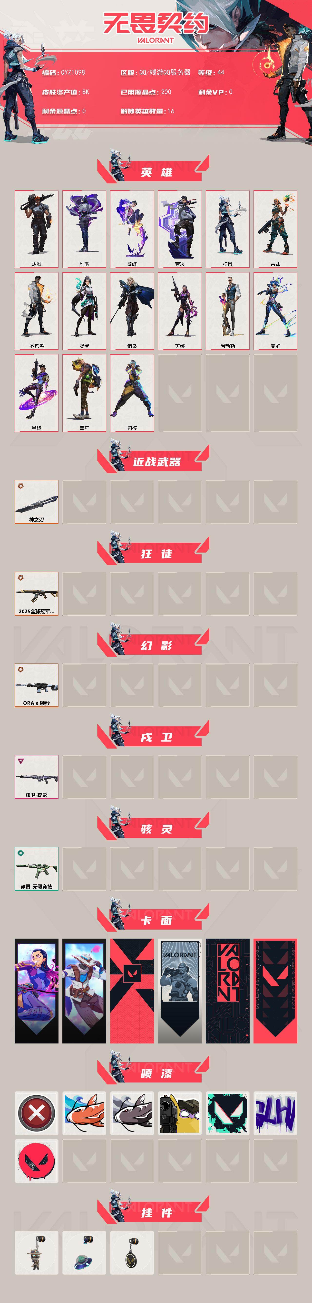 【qyz1098】终极2/传奇1/卓越1/皮肤7/等级44/段位:黑铁/幻棱/炼狱/维斯/暮蝶/壹决/捷风/雷兹/不死鸟/贤者/猎枭/芮娜/尚勃勒/霓虹/星礈/盖可/近战武器-神之刃/狂徒-2025全球冠军赛/幻影-a x 颗秒/戍卫-掠影/骇灵-无限竞技/无畏契约go!第一卷:芮娜 卡面/无畏契约go!第一卷:零 卡面/代号红色 卡面/新兵报到 卡面/v契约 卡面/无畏契约 卡面/买装还是存钱 喷漆/红鳞 喷漆/松叶 喷漆/放下武器 喷漆/胜利属于无畏契约 喷漆/glhf 喷漆/无畏契约 喷漆/无畏契约go!第一卷 零 挂饰/天外飞客 挂饰/无畏契约 纪念币 挂饰