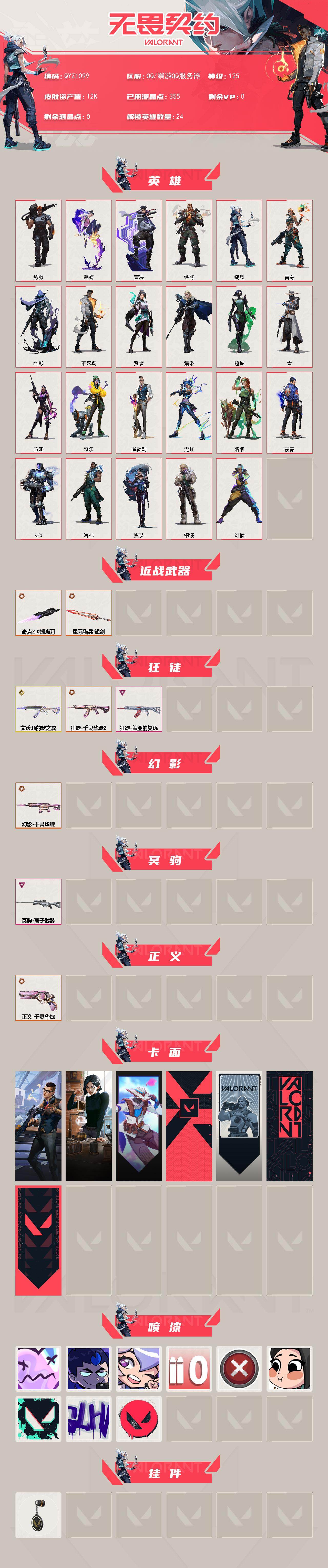【qyz1099】终极5/传奇1/卓越2/皮肤22/等级125/段位:青铜/幻棱/炼狱/暮蝶/壹决/铁臂/捷风/雷兹/幽影/不死鸟/贤者/猎枭/蝰蛇/零/芮娜/奇乐/尚勃勒/霓虹/斯凯/夜露/k/o/海神/黑梦/钢锁/近战武器-奇点//2.0 蝴蝶刀/近战武器-星际猎兵 短剑/狂徒-艾沃莉的梦之翼/狂徒-千灵华绽//2.0/狂徒-盖亚的复仇/幻影-千灵华绽/冥驹-离子武器/正义-千灵华绽/西装暴徒 卡面/虹吸式咖啡壶 卡面/无畏契约go!第一卷:零 卡面/代号红色 卡面/新兵报到 卡面/v契约 卡面/无畏契约 卡面/伤心心 喷漆/终极羞辱 喷漆/超能偶像 喷漆/拼一呛 喷漆/买装还是存钱 喷漆/辣得好下饭 喷漆/胜利属于无畏契约 喷漆/glhf 喷漆/无畏契约 喷漆/无畏契约 纪念币 挂饰