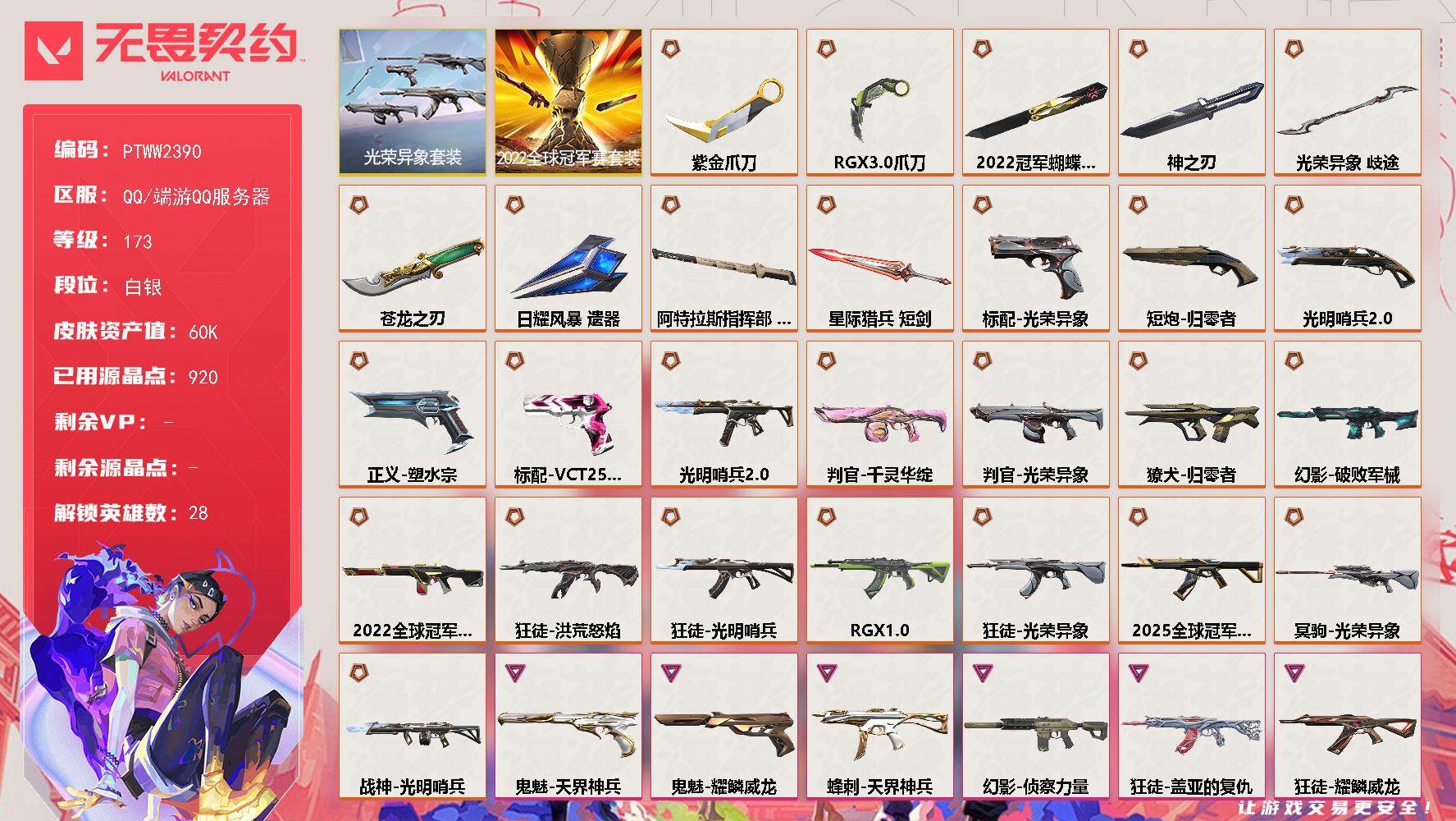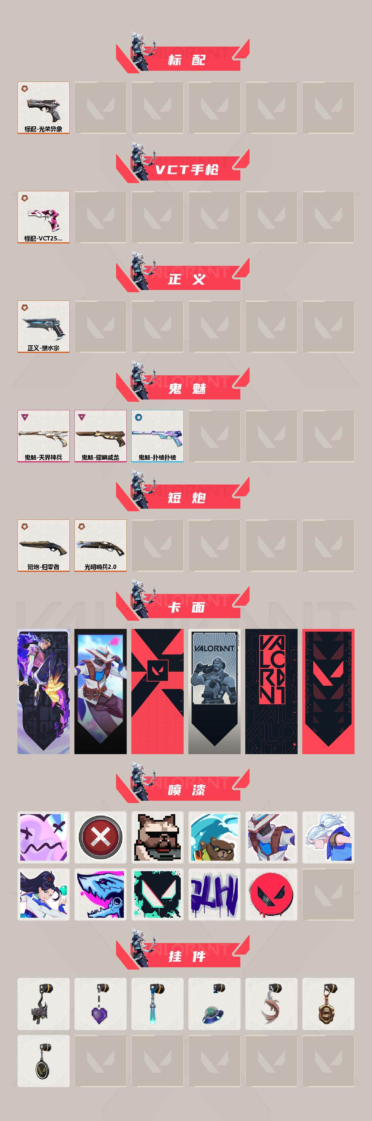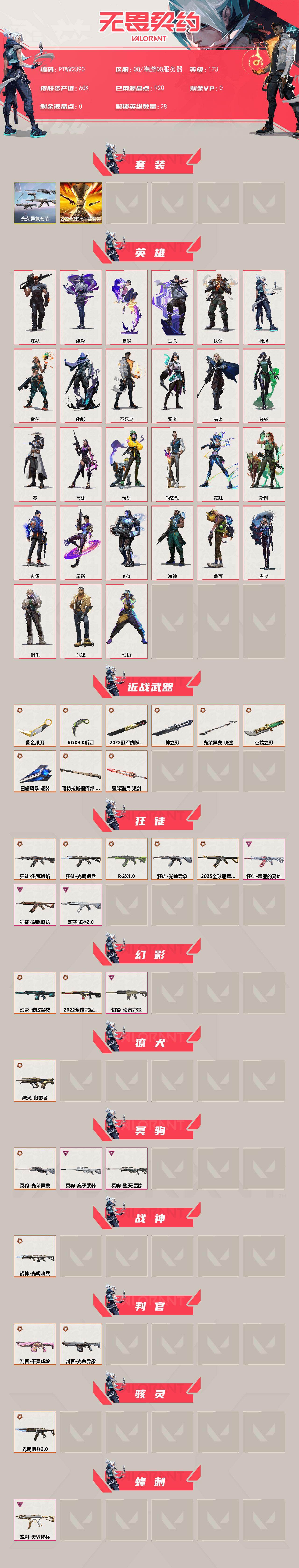 【套装】:2022全球冠军赛套装,光荣异象套装 【英雄】:幻棱,炼狱,维斯,暮蝶,钛狐,壹决,铁臂,捷风,雷兹,幽影,不死鸟,贤者,猎枭,蝰蛇,零,芮娜,奇乐,尚勃勒,霓虹,斯凯,夜露,星礈,k/o,海神,盖可,黑梦,钢锁 【近战武器】:近战武器-2022全球冠军赛 蝴蝶刀,近战武器-5周年//公测重制版 苍龙之刃,近战武器-光荣异象 歧途,近战武器-神之刃,近战武器-紫金爪刀,近战武器-rg