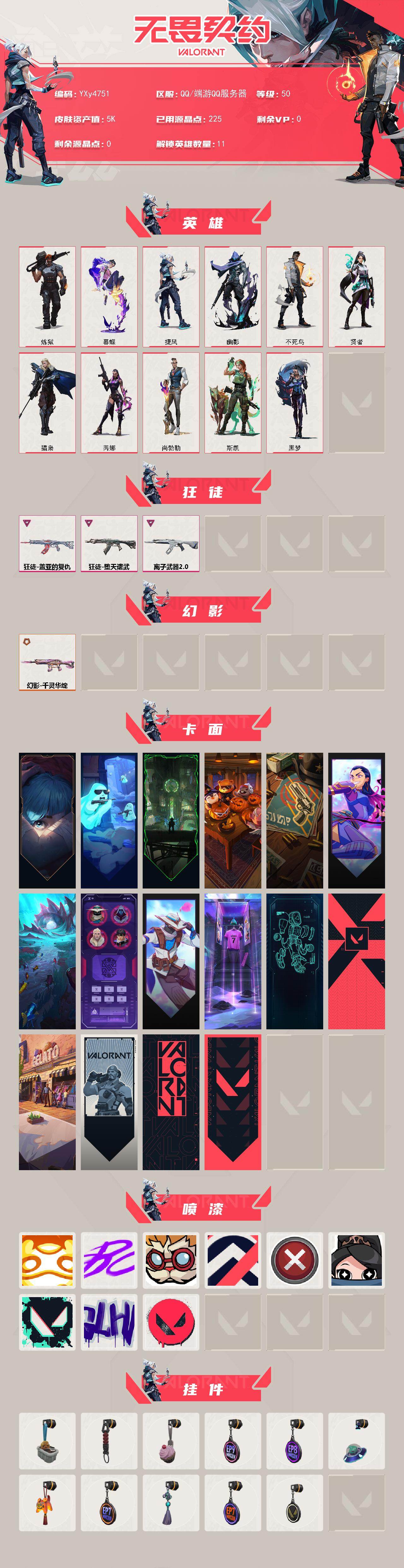 【英雄】:炼狱,暮蝶,捷风,幽影,不死鸟,贤者,猎枭,芮娜,尚勃勒,斯凯,黑梦 【狂徒】:狂徒-堕天遗武,狂徒-盖亚的复仇,狂徒-离子武器//2.0 【幻影】:幻影-千灵华绽 【卡面】:《双城之战》拥抱 卡面,精灵大战 卡面,欢迎来到底城 卡面,南瓜盛典 卡面,正义的化身 卡面,无畏契约go!第一卷:芮娜 卡面,珍珠棘贝 卡面,清除名单 卡面,无畏契约go!第一卷:零 卡面,"luie" 卡面,铁臂设计图 卡面,代号红色 卡面,冰淇淋店 卡面,新兵报到 卡面,v契约 卡面,无畏契约 卡面 【喷漆】:嗨宝南瓜灯 喷漆,嘭! 喷漆,都算到了 喷漆,控场勿近 喷漆,买装还是存钱 喷漆,口袋贤者 喷漆,胜利属于无畏契约 喷漆,glhf 喷漆,无畏契约 喷漆 【挂饰】:悠闲鸡块 挂饰,伞绳 挂饰,《双城之战》小蛋糕 挂饰,第九季//第三幕 纪念币 挂饰,第八季//第二幕 纪念币 挂饰 ,天外飞客 挂饰,好运福爪 挂饰,第七季//第三幕 纪念币 挂饰,幸运中国结 挂饰,第七季//第二幕 纪念币 挂饰,无畏契约 纪念币 挂饰