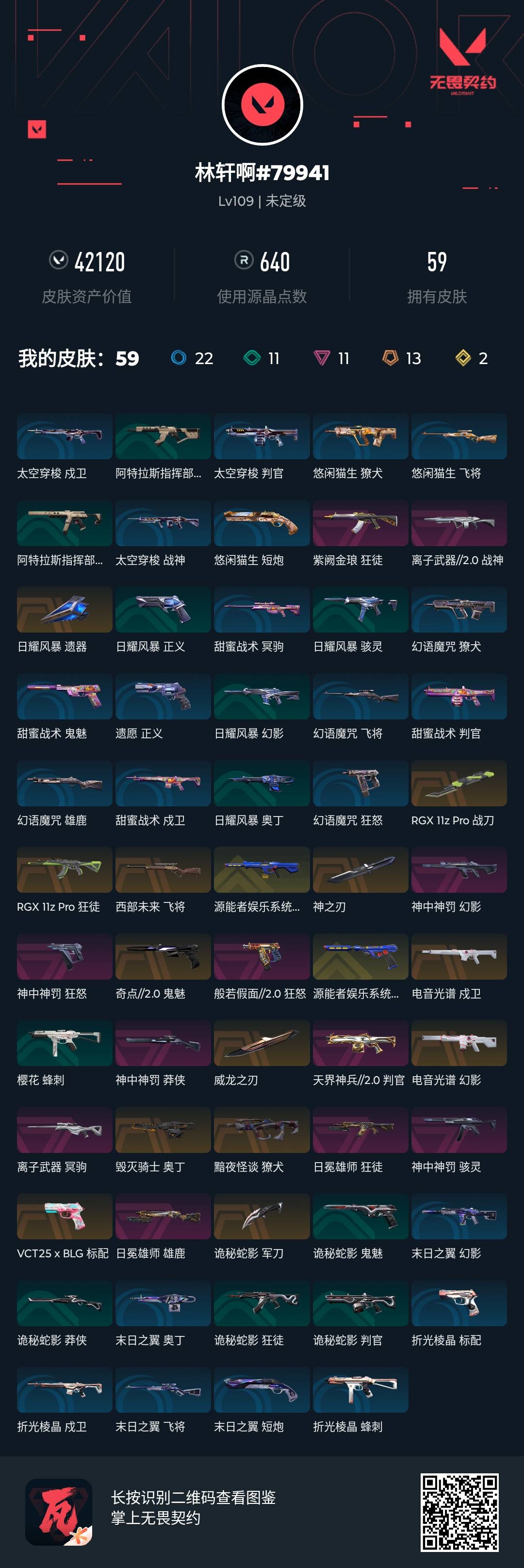 [16314529]l188302 (神中神罚套装)无畏契约/107等级/未定级/英雄16/皮肤59/资产42120/已使用r点600/剩余r点0/10rgx-11z-pro-狂徒,电音光谱-戍卫,电音光谱-幻影,黯夜怪谈-獠犬,源能者娱乐系统-幻影,紫阙金琅-狂徒,日冕雄师-狂徒,日耀风暴-遗器,诡秘蛇影-军刀,rgx-11z-pro-战刀,威龙之刃,神中神罚-幻影神中神罚-莽侠神中神罚-骇灵神中神罚-狂怒神之刃,西部未来-飞将,离子武器-冥驹,毁灭骑士-奥丁,离子武器//2.0-战神,天界神兵//2.0-判官,日冕雄师-雄鹿