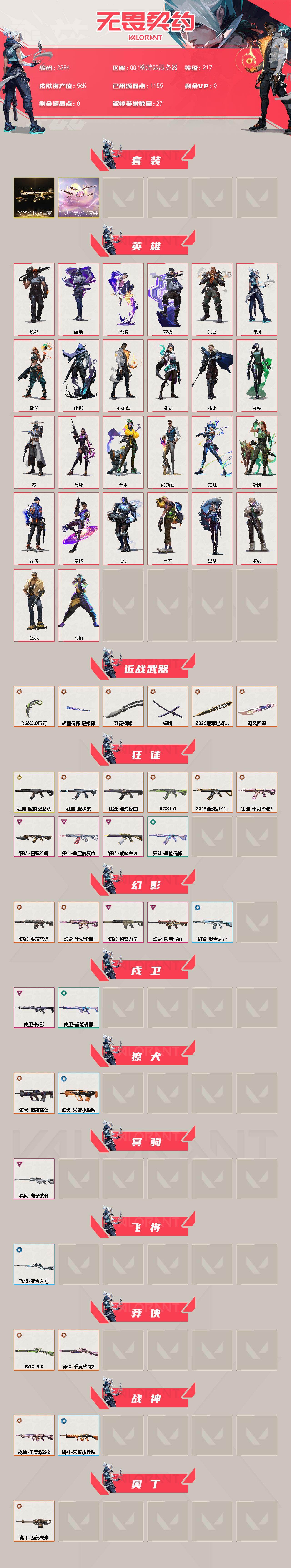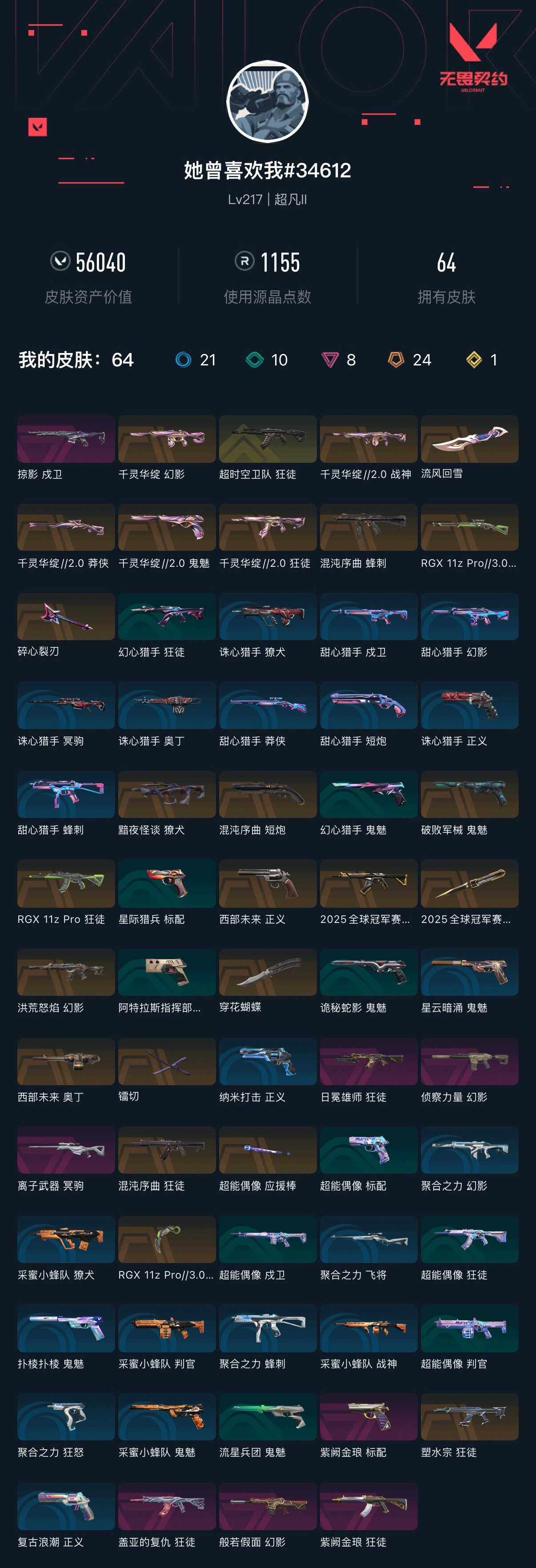 [16319100]【套装】:2025全球冠军赛套装,千灵华绽//2.0套装 【英雄】:幻棱,炼狱,维斯,暮蝶,钛狐,壹决,铁臂,捷风,雷兹,幽影,不死鸟,贤者,猎枭,蝰蛇,零,芮娜,奇乐,尚勃勒,霓虹,斯凯,夜露,星礈,k/o,盖可,黑梦,钢锁 【近战武器】:近战武器-2025全球冠军赛 蝴蝶刀,近战武器-流风回雪,近战武器-穿花蝴蝶,近战武器-rgx 11z pro//3.0 爪刀,近战武器-镭切,近战武器-超能偶像 应援棒 【狂徒】:狂徒-超时空卫队,狂徒-2025全球冠军赛,狂徒-混沌序曲,狂徒-塑水宗,狂徒-rgx 11z pro,狂徒-千灵华绽//2.0,狂徒-盖亚的复仇,狂徒-日冕雄师,狂徒-紫阙金琅,狂徒-超能偶像 【幻影】:幻影-洪荒怒焰,幻影-千灵华绽,幻影-般若假面,幻影-侦察力量,幻影-聚合之力 【戍卫】:戍卫-掠影,戍卫-超能偶像 【獠犬】:獠犬-黯夜怪谈,獠犬-采蜜小蜂队 【冥驹】:冥驹-离子武器 【飞将】:飞将-聚合之力 【莽侠】:莽侠-rgx 11z pro//3.0,莽侠-千灵华绽//2.0 【战神】:战神-千灵华绽//2.0,战神-采蜜小蜂队 【奥丁】:奥丁-西部未来 【判官】:判官-超能偶像,判官-采蜜小蜂队 【蜂刺】:蜂刺-混沌序曲,蜂刺-聚合之力 【标配】:标配-紫阙金琅,标配-超能偶像 【正义】:正义-西部未来,正义-复古浪潮,正义-纳米打击 【鬼魅】:鬼魅-破败军械,鬼魅-千灵华绽//2.0,鬼魅-流星兵团,鬼魅-诡秘蛇影,鬼魅-采蜜小蜂队,鬼魅-扑棱扑棱,鬼魅-星云暗涌 【狂怒】:狂怒-聚合之力 【短炮】:短炮-混沌序曲 【卡面】:终章:激斗汉堡 卡面,进入射程 卡面,《双城之战》拥抱 卡面,精灵大战 卡面,欢迎来到底城 卡面,南瓜盛典 卡面,无畏契约:暮蝶 卡面,战术桌游 卡面,修车达人 卡面,正义的化身 卡面,终章:生意人麦宝 卡面,铁之华 卡面,失而复得 卡面,时间到 卡面,最高舞台 卡面,复活专家 卡面,归乡 // 蝰蛇 卡面,超能偶像 卡面,生意人麦宝 卡面,音熊登场 卡面,树懒大作战 卡面,声感陷阱设计图 卡面,钢锁工牌 卡面,战术小伙伴的夏日 卡面,采蜜小蜂队 卡面,聚合之力 卡面,梦幻奶茶 卡面,趁热吃 卡面,源能反应 卡面,零点嗅探设计图 卡面,表象之下 卡面,沙雕爆能器 卡面,无畏契约go!第一卷:芮娜 卡面,复古浪