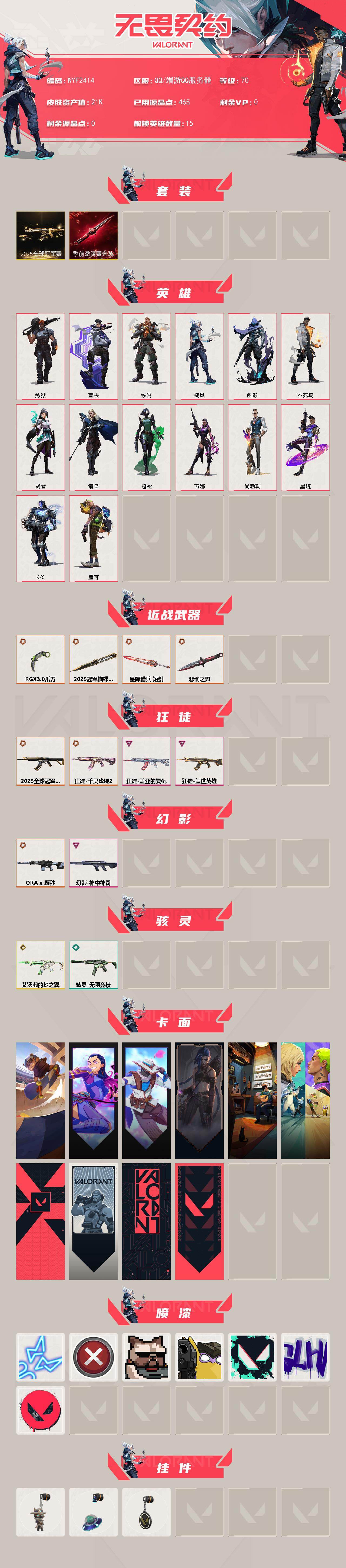 【wyf2414】终极7/传奇2/卓越3/皮肤36/等级70/段位:未定级/2025全球冠军赛套装/无畏契约季前邀请赛套装/炼狱/壹决/铁臂/捷风/幽影/不死鸟/贤者/猎枭/蝰蛇/芮娜/尚勃勒/星礈/k/o/盖可/近战武器-2025全球冠军赛 蝴蝶刀/近战武器-无畏契约季前邀请赛 悲悯之刃/近战武器-rgx 11z pro//3.0 爪刀/近战武器-星际猎兵 短剑/狂徒-2025全球冠军赛/狂徒-千灵华绽//2.0/狂徒-盖世英雄/狂徒-盖亚的复仇/幻影-a x 颗秒/幻影-神中神罚/骇灵-艾沃莉的梦之翼/骇灵-无限竞技/clutch 卡面/无畏契约go!第一卷:芮娜 卡面/无畏契约go!第一卷:零 卡面/《双城之战》金克丝 卡面/完美调谐 卡面 /钢锁vs盖可 卡面/代号红色 卡面/新兵报到 卡面/v契约 卡面/无畏契约 卡面/霓光四射 喷漆/买装还是存钱 喷漆/关门放狗 喷漆/放下武器 喷漆/胜利属于无畏契约 喷漆/glhf 喷漆/无畏契约 喷漆/无畏契约go!第一卷 零 挂饰/天外飞客 挂饰/无畏契约 纪念币 挂饰