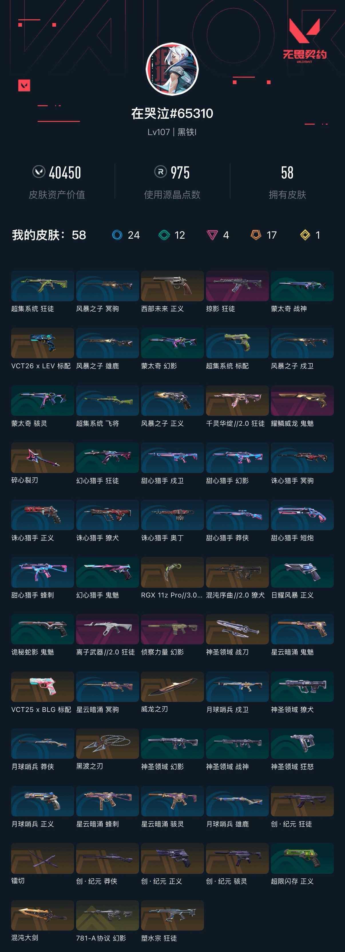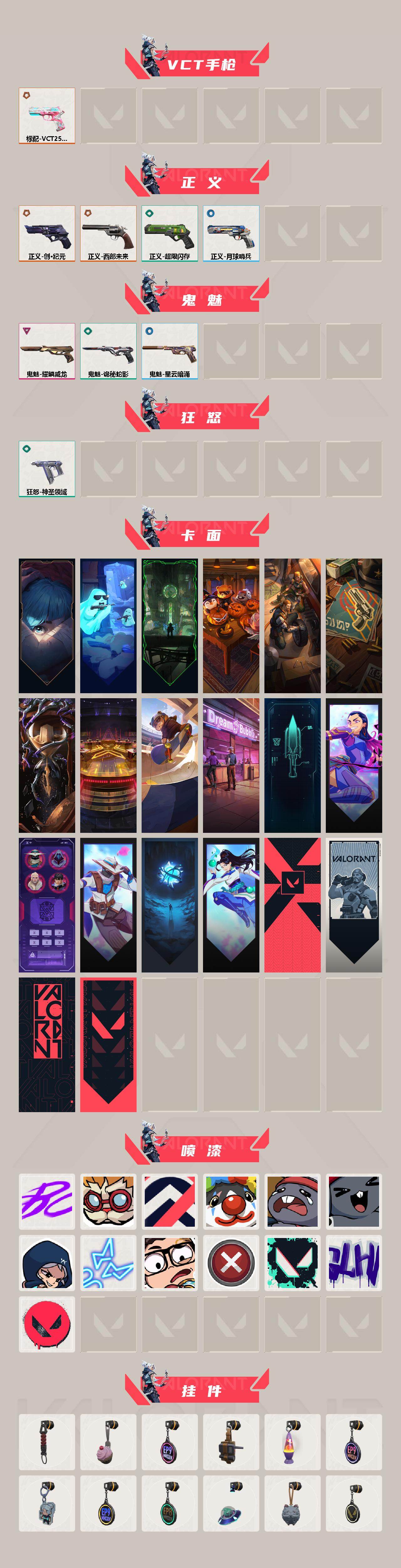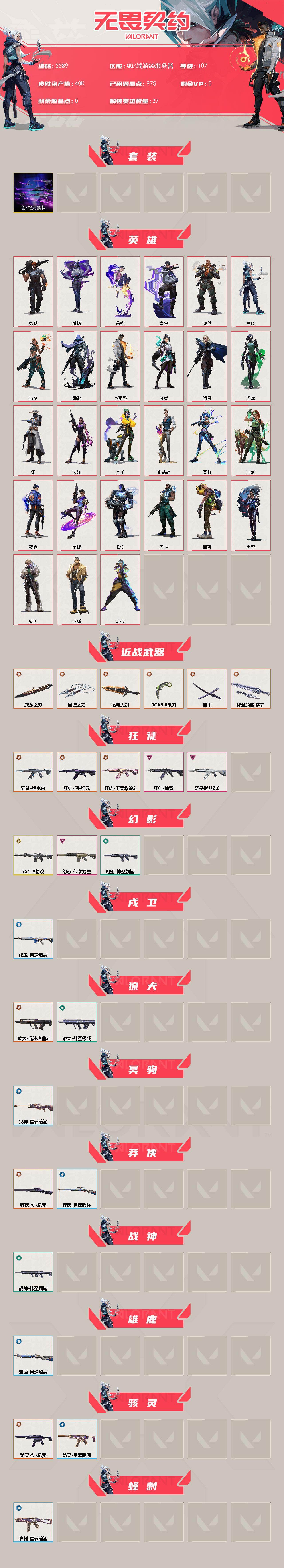 [16319889]【套装】:创·纪元套装 【英雄】:幻棱,炼狱,维斯,暮蝶,钛狐,壹决,铁臂,捷风,雷兹,幽影,不死鸟,贤者,猎枭,蝰蛇,零,芮娜,奇乐,尚勃勒,霓虹,斯凯,夜露,星礈,k/o,海神,盖可,黑梦,钢锁 【近战武器】:近战武器-rgx 11z pro//3.0 爪刀,近战武器-黑波之刃,近战武器-镭切,近战武器-威龙之刃,近战武器-混沌大剑,近战武器-神圣领域 战刀 【狂徒】:狂徒-塑水宗,狂徒-创·纪元,狂徒-千灵华绽//2.0,狂徒-掠影,狂徒-离子武器//2.0 【幻影】:幻影-781-a协议,幻影-侦察力量,幻影-神圣领域 【戍卫】:戍卫-月球哨兵 【獠犬】:獠犬-混沌序曲//2.0,獠犬-神圣领域 【冥驹】:冥驹-星云暗涌 【莽侠】:莽侠-创·纪元,莽侠-月球哨兵 【战神】:战神-神圣领域 【雄鹿】:雄鹿-月球哨兵 【骇灵】:骇灵-创·纪元,骇灵-星云暗涌 【蜂刺】:蜂刺-星云暗涌 【vct手呛】:标配-vct25 x blg 【正义】:正义-创·纪元,正义-西部未来,正义-超限闪存,正义-月球哨兵 【鬼魅】:鬼魅-耀鳞威龙,鬼魅-诡秘蛇影,鬼魅-星云暗涌 【狂怒】:狂怒-神圣领域 【卡面】:《双城之战》拥抱 卡面,精灵大战 卡面,欢迎来到底城 卡面,南瓜盛典 卡面,修车达人 卡面,正义的化身 卡面,时间到 卡面,最高舞台 卡面,clutch 卡面,梦幻奶茶 卡面,零点嗅探设计图 卡面,无畏契约go!第一卷:芮娜 卡面,清除名单 卡面,无畏契约go!第一卷:零 卡面,无垠星环 卡面,无畏契约go!第一卷:贤者 卡面,代号红色 卡面,新兵报到 卡面,v契约 卡面,无畏契约 卡面 【喷漆】:嘭! 喷漆,都算到了 喷漆,控场勿近 喷漆,小丑猫 喷漆,熊抱 喷漆,超级粉丝 喷漆,捷风差距 喷漆,霓光四射 喷漆,新潮流 喷漆,买装还是存钱 喷漆,胜利属于无畏契约 喷漆,glhf 喷漆,无畏契约 喷漆 【挂饰】:伞绳 挂饰,《双城之战》小蛋糕 挂饰,第九季//第三幕 纪念币 挂饰,工具腰带 挂饰,熔岩灯 挂饰,第九季//第二幕 纪念币 挂饰,袖珍捷风 挂饰,第九季//第一幕 纪念币 挂饰,第八季//第三幕 纪念币 挂饰,天外飞客 挂饰,《双城之战》魄罗 挂饰,无畏契约 纪念币 挂饰