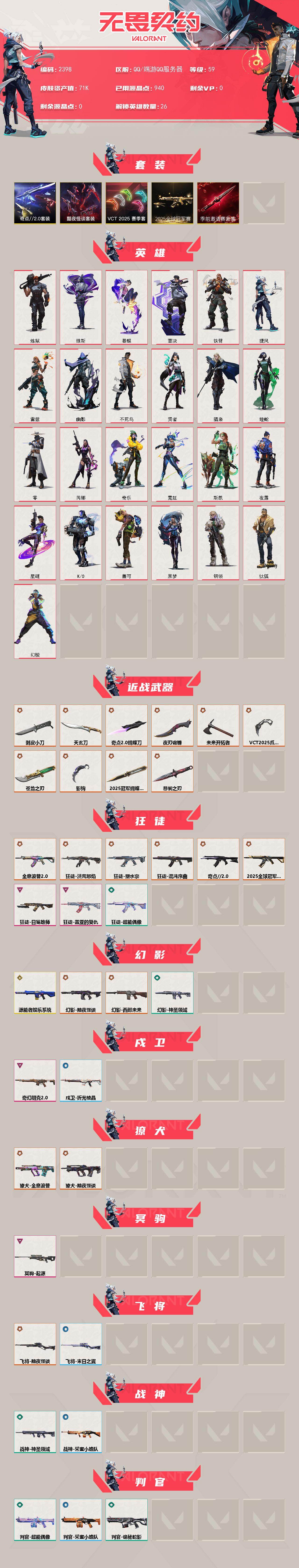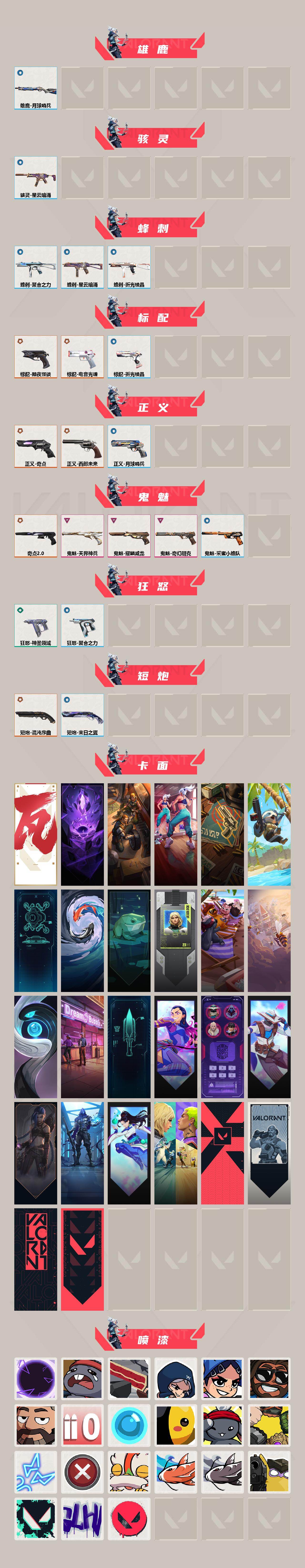 [16320863]【套装】:2025全球冠军赛套装,无畏契约季前邀请赛套装,vct 2025 赛季套装,奇点//2.0套装,黯夜怪谈套装 【英雄】:幻棱,炼狱,维斯,暮蝶,钛狐,壹决,铁臂,捷风,雷兹,幽影,不死鸟,贤者,猎枭,蝰蛇,零,芮娜,奇乐,霓虹,斯凯,夜露,星礈,k/o,盖可,黑梦,钢锁 【近战武器】:近战武器-2025全球冠军赛 蝴蝶刀,近战武器-无畏契约季前邀请赛 悲悯之刃,近战武器-影钩,近战武器-5周年//公测重制版 苍龙之刃,近战武器-剥皮小刀,近战武器-奇点//2.0 蝴蝶刀,近战武器-vct 2025 爪刀,近战武器-未来开拓者,近战武器-天玄刀,近战武器-夜刃诡镰 【狂徒】:狂徒-2025全球冠军赛,狂徒-洪荒怒焰,狂徒-混沌序曲,狂徒-奇点//2.0,狂徒-全息波普//2.0,狂徒-塑水宗,狂徒-盖亚的复仇,狂徒-日冕雄师,狂徒-超能偶像 【幻影】:幻影-源能者娱乐系统,幻影-黯夜怪谈,幻影-西部未来,幻影-神圣领域,幻影-西部未来 【戍卫】:戍卫-奇幻朋克//2.0,戍卫-折光棱晶 【獠犬】:獠犬-黯夜怪谈,獠犬-全息波普 【冥驹】:冥驹-起源 【飞将】:飞将-黯夜怪谈,飞将-末日之翼 【战神】:战神-神圣领域,战神-采蜜小蜂队 【判官】:判官-超能偶像,判官-诡秘蛇影,判官-采蜜小蜂队 【雄鹿】:雄鹿-月球哨兵 【骇灵】:骇灵-星云暗涌 【蜂刺】:蜂刺-聚合之力,蜂刺-星云暗涌,蜂刺-折光棱晶 【标配】:标配-黯夜怪谈,标配-电音光谱,标配-折光棱晶,标配-电音光谱 【正义】:正义-奇点,正义-西部未来,正义-月球哨兵 【鬼魅】:鬼魅-奇点//2.0,鬼魅-奇幻朋克,鬼魅-天界神兵,鬼魅-耀鳞威龙,鬼魅-采蜜小蜂队 【狂怒】:狂怒-神圣领域,狂怒-聚合之力 【短炮】:短炮-混沌序曲,短炮-末日之翼 【卡面】:vct cn首冠 卡面,奇点//2.0 卡面,修车达人 卡面,热舞环节 卡面,正义的化身 卡面,树懒大作战 卡面,声感陷阱设计图 卡面,红鳞松叶 卡面,霓帧牛蛙 卡面,钢锁工牌 卡面,战术小伙伴的夏日 卡面,采蜜小蜂队 卡面,聚合之力 卡面,梦幻奶茶 卡面,零点嗅探设计图 卡面,无畏契约go!第一卷:芮娜 卡面,清除名单 卡面,无畏契约go!第一卷:零 卡面,《双城之战》金克丝 卡面,暗呛 卡面,无畏契约go!第一卷:贤者 卡面,钢锁vs盖可 卡