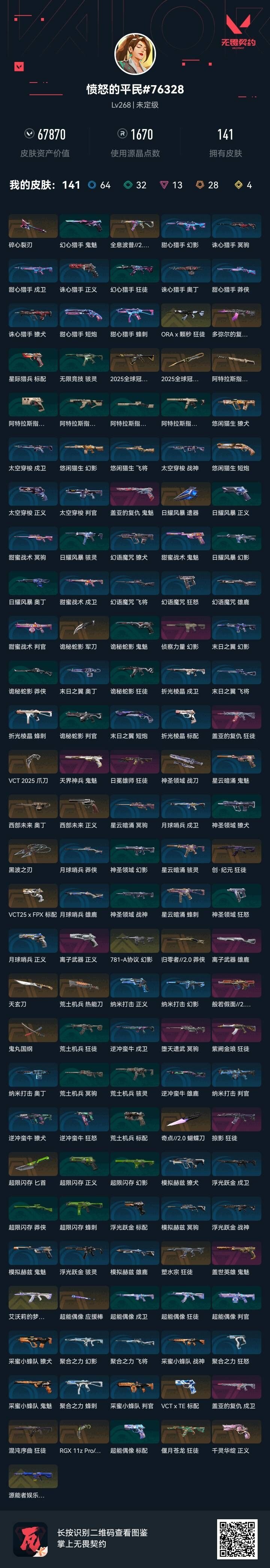 28橙皮 4金皮 13紫皮 141皮肤 28英雄 210卡面 1670已用源晶 未定级段位 【套装】vcn2025套装vct 2025赛季礼包2025全球冠军赛 【近战武器皮肤】匕首-超限闪存日耀风暴 遗器阿特拉斯指挥部蝴蝶刀-奇点//2.0神圣领域 战刀诡秘蛇影vct 202
