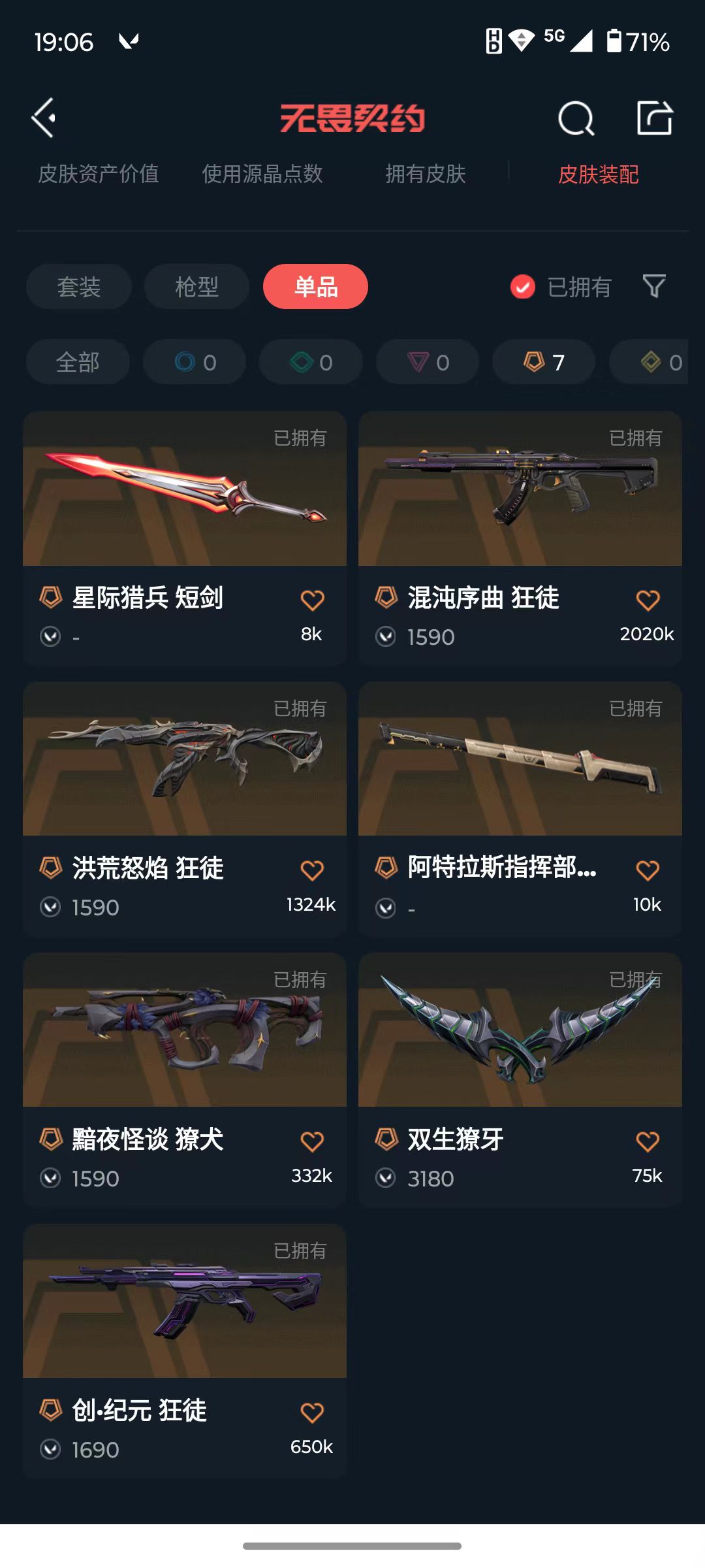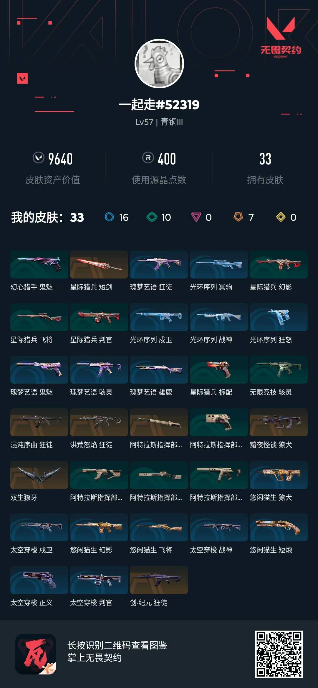 [16324054]s193361无畏契约/57等级/青铜段位/19英雄/33皮肤/资产9640/已使用r点400/剩余r点195/ 创·纪元-狂徒,混沌序曲-狂徒,黯夜怪谈-獠犬,洪荒怒焰-狂徒,星际猎兵-短剑,阿特拉斯指挥部-甩棍,双生獠牙