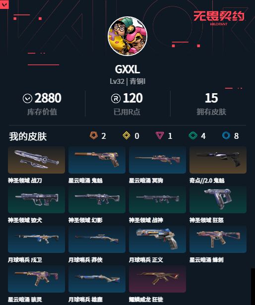 wl622/【账号状态】无封号/【区服】qq/【游戏等级】lv32/【游戏段位】青铜i/【剩余v点】480/【剩余r点】200/【皮肤资产价值】2880/【使用r点】120/【英雄数量】11/【皮肤数量】15/【卡面数量】36/【喷漆数量】28/【挂件数量】23/【拥有套装】/【拥有近战武器】神圣领