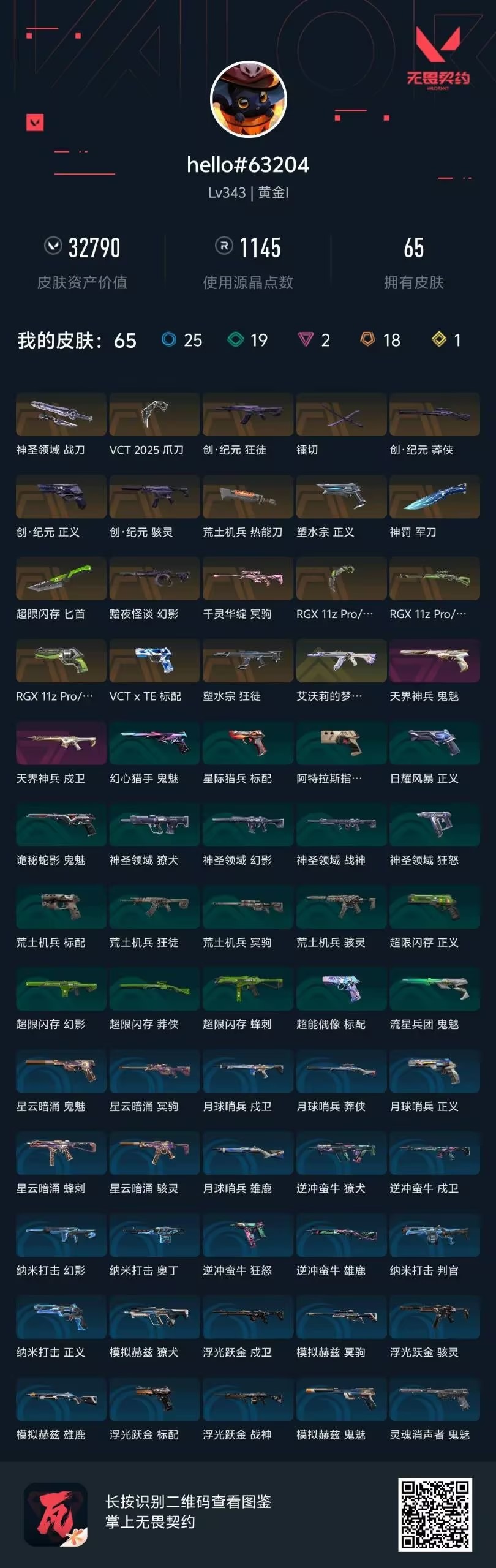 [16336244]18橙皮 1金皮 2紫皮 65皮肤 28英雄 150卡面 1145已用源晶 黄金段位 【套装】vctcn2025套装创·纪元套装vct 2025赛季礼包rgx 11z pro//3.0套装 【近战武器皮肤】匕首-超限闪存vct 2025 爪刀神圣领域 战刀镭切荒土机兵热能刀爪刀-rgx 11z pro 3.0军刀-神罚 【佩呛皮肤】正义-创·纪元正义-塑水宗正义-rgx 11z pro 3.0鬼魅-天界神兵标配-vctxte 【冲锋呛皮肤】骇灵-创·纪元 【步呛皮肤】狂徒-创·纪元幻影-黯夜怪谈狂徒-艾沃莉的梦之翼狂徒-塑水宗戍卫-天界神兵 【狙击呛皮肤】莽侠-创·纪元冥驹-千灵华绽莽侠-rgx 11z pro 3.0 【挂饰】袖珍捷风挂饰薰衣草之心挂饰vct2025太平洋联赛挂饰vct2025美洲联赛挂饰vct2025emea联赛挂饰传世莲华挂饰vct2025cn联赛挂饰v26第一幕纪念币 挂饰v25第三幕超凡挂饰vctxte挂饰双城之战魄罗挂饰糖葫芦挂饰蓄势待滚挂饰rgx11zpro3.0挂饰双面黑猫挂饰鱼骨头挂饰双城之战小蛋糕挂饰终章ko小金人挂饰飞刀挂饰创纪元挂饰h2-oh!挂饰