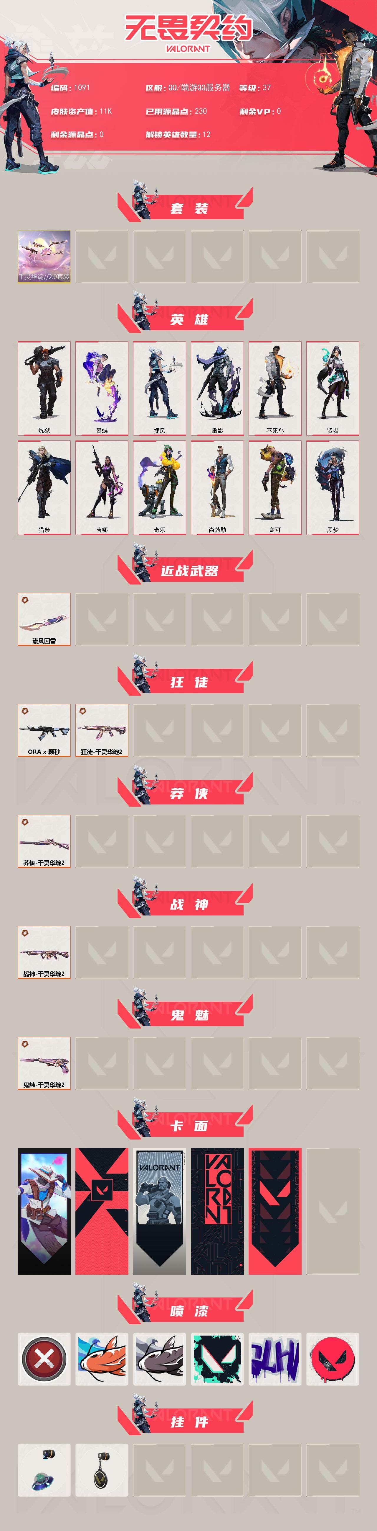 [16337248]【套装】:千灵华绽//2.0套装 【英雄】:炼狱,暮蝶,捷风,幽影,不死鸟,贤者,猎枭,芮娜,奇乐,尚勃勒,盖可,黑梦 【近战武器】:近战武器-流风回雪 【狂徒】:狂徒-a x 颗秒,狂徒-千灵华绽//2.0 【莽侠】:莽侠-千灵华绽//2.0 【战神】:战神-千灵华绽//2.0 【鬼魅】:鬼魅-千灵华绽//2.0 【卡面】:无畏契约go!第一卷:零 卡面,代号红色 卡面,新兵报到 卡面,v契约 卡面,无畏契约 卡面 【喷漆】:买装还是存钱 喷漆,红鳞 喷漆,松叶 喷漆,胜利属于无畏契约 喷漆,glhf 喷漆,无畏契约 喷漆 【挂饰】:天外飞客 挂饰,无畏契约 纪念币 挂饰