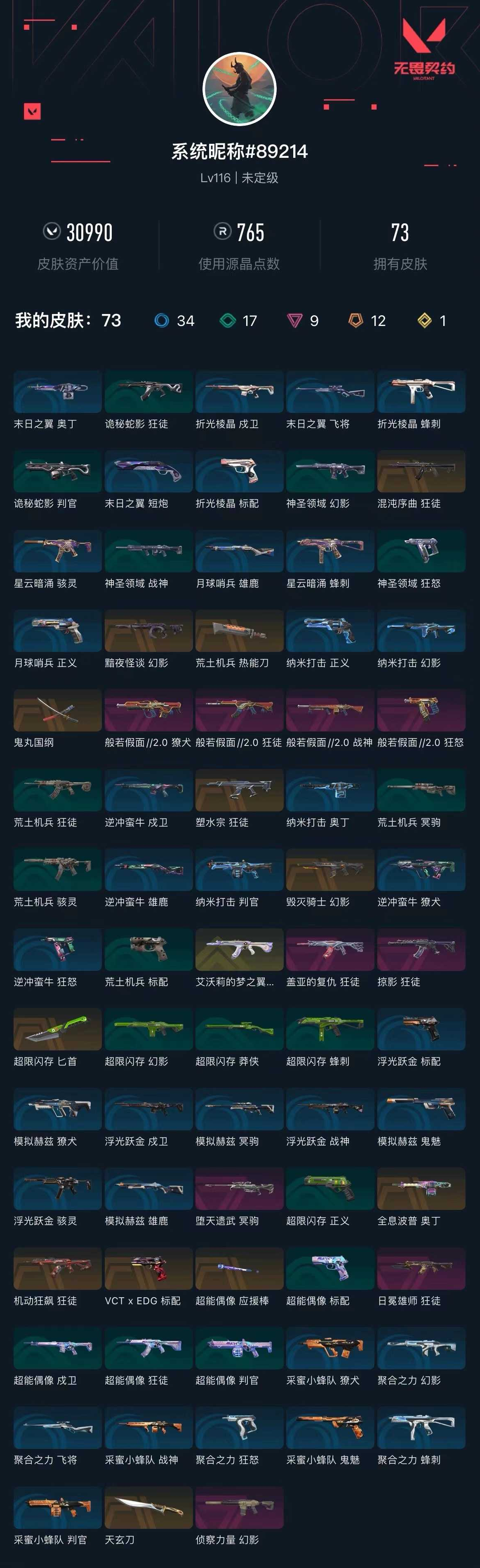 【无畏契约】【yhwww8993】等级:116,已用无畏点30990,已用源晶点765,金皮:狂徒-艾沃莉的梦之翼__橙皮:标配-vct x edg|奥丁-全息波普|幻影-黯夜怪谈|近战-超限闪存 匕首|近战-超能偶像 应援棒|近战-天玄刀|狂徒-机动狂飙|狂徒-塑水宗|狂徒-混沌序曲|近战-荒土机兵 热能刀|幻影-毁灭骑士|近战-鬼丸国纲__紫皮:狂徒-日冕雄师|幻影-侦察力量|狂徒-盖亚的复仇|冥驹-堕天遗武|狂徒-掠影|战神-般若假面2.0|獠犬-般若假面2.0|狂徒-般若假面2.0|狂怒-般若假面2.0__段位:未定级__蓝皮:判官-纳米打击|正义-纳米打击|奥丁-纳米打击|幻影-纳米打击|雄鹿-逆冲蛮牛|狂怒-逆冲蛮牛|戍卫-逆冲蛮牛|獠犬-逆冲蛮牛|骇灵-星云暗涌|正义-月球哨兵|雄鹿-月球哨兵|鬼魅-采蜜小蜂队|战神-采蜜小蜂队|獠犬-采蜜小蜂队|判官-采蜜小蜂队|骇灵-浮光跃金|标配-浮光跃金|戍卫-浮光跃金|战神-浮光跃金|蜂刺-聚合之力|幻影-聚合之力|狂怒-聚合之力|飞将-聚合之力|鬼魅-模拟赫兹|獠犬-模拟赫兹|冥驹-模拟赫兹|雄鹿-模拟赫兹|蜂刺-星云暗涌|蜂刺-折光棱晶|戍卫-折光棱晶|标配-折光棱晶|飞将-末日之翼|短炮-末日之翼|奥丁-末日之翼__绿皮:狂徒-荒土机兵|标配-荒土机兵|骇灵-荒土机兵|冥驹-荒土机兵|狂怒-神圣领域|战神-神圣领域|幻影-神圣领域|戍卫-超能偶像|标配-超能偶像|狂徒-超能偶像|判官-超能偶像|正义-超限闪存|莽侠-超限闪存|幻影-超限闪存|蜂刺-超限闪存|判官-诡秘蛇影|狂徒-诡秘蛇影__英雄:尚勃勒|维斯|黑梦|斯凯|暮蝶|盖可|霓虹|壹决|星礈|k/o|幽影|夜露|钢锁|海神|奇乐|炼狱|铁臂|贤者|猎枭|钛狐|芮娜|零|捷风|蝰蛇|不死鸟|幻棱|雷兹|禁灭