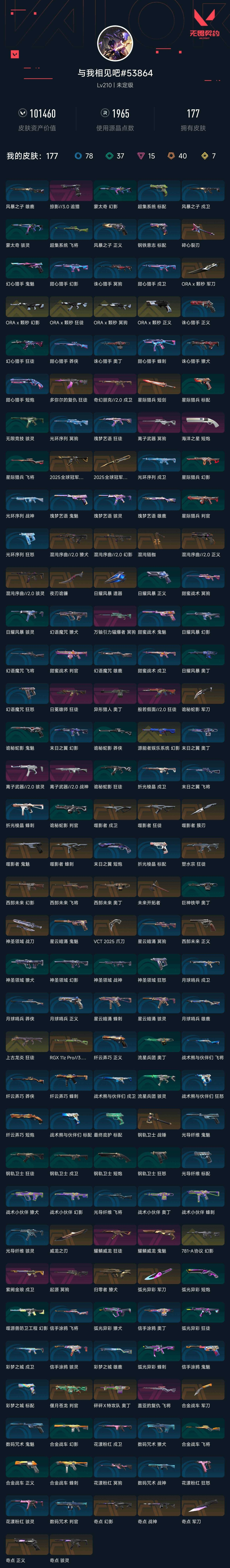 【无畏契约】【yhwww8976】等级:210,已用无畏点101460,已用源晶点1965,金皮:幻影-781-a协议|幻影-源能者娱乐系统|狂徒-上古龙炎|狂徒-a x 颗秒|幻影-a x 颗秒|冥驹-a x 颗秒|正义-a x 颗秒__橙皮:奥丁-砰砰x特攻队|骇灵-奇点|幻影-奇点|近战-弧光异彩 军刀|近战-钢轨卫士 战锤|近战-威龙之刃|近战-夜刃诡镰|莽侠-rgx 11z pro3.0|近战-奇点 军刀|狂徒-塑水宗|獠犬-归零者|正义-奇点|战神-奇点|判官-偃月苍龙|近战-合金战车 军刀|近战-神圣领域 战刀|飞将-西部未来|正义-西部未来|奥丁-西部未来|幻影-西部未来|近战-未来开拓者|近战-vct 2025 爪刀|近战-诡秘蛇影 军刀|近战-噬影者 簇刃|蜂刺-噬影者|鬼魅-噬影者|狂徒-噬影者|戍卫-噬影者|近战-日耀风暴 遗器|近战-星际猎兵 短剑|狂徒-2025全球冠军赛|近战-2025全球冠军赛 蝴蝶刀|幻影-混沌序曲2.0|獠犬-混沌序曲2.0|正义-混沌序曲2.0|骇灵-混沌序曲2.0|近战-混沌链枷|狂徒-多弥尔的复仇|近战-a x 颗秒 军刀__紫皮:奥丁-异形猎人|飞将-盖亚的复仇|短炮-海洋之星|鬼魅-耀鳞威龙|狂徒-日冕雄师|冥驹-离子武器|狂徒-耀鳞威龙|冥驹-起源|戍卫-紫阙金琅|狂徒-般若假面2.0|戍卫-奇幻朋克2.0|战神-离子武器2.0|骇灵-离子武器2.0__绿皮:短炮-钢轨卫士|狂怒-钢轨卫士|狂徒-钢轨卫士|戍卫-钢轨卫士|蜂刺-合金战车|正义-合金战车|幻影-合金战车|飞将-合金战车|骇灵-无限竞技|獠犬-神圣领域|狂怒-神圣领域|战神-神圣领域|幻影-神圣领域|奥丁-巨神铁甲|短炮-弧光异彩|獠犬-弧光异彩|蜂刺-弧光异彩|狂徒-弧光异彩|骇灵-流星兵团|奥丁-流星兵团|幻影-噬源兽防卫工程|判官-诡秘蛇影|鬼魅-诡秘蛇影|莽侠-诡秘蛇影|狂徒-诡秘蛇影|正义-日耀风暴|幻影-日耀风暴|奥丁-日耀风暴|判官-星际猎兵|飞将-星际猎兵|标配-星际猎兵|狂徒-幻心猎手|鬼魅-幻心猎手__蓝皮:鬼魅-光导纤维|飞将-光导纤维|标配-光导纤维|骇灵-光导纤维|标配-最终庇护|狂怒-花漾粉红|骇灵-花漾粉红|戍卫-花漾粉红|冥驹-花漾粉红|战神-数码咒术|獠犬-数码咒术|判官-数码咒术|鬼魅-数码咒术|鬼魅-星云暗涌|骇灵-星云暗涌|正义-月球哨兵|莽侠-月球哨兵|戍卫-月球哨兵|雄鹿-月球哨兵|戍卫-彩梦之城|雄鹿-彩梦之城|标配-彩梦之城|标配-钢铁意志|莽侠-纤云弄巧|正义-纤云弄巧|短炮-纤云弄巧|蜂刺-纤云弄巧|鬼魅-信手涂鸦|骇灵-信手涂鸦|奥丁-信手涂鸦|飞将-信手涂鸦|冥驹-星云暗涌|蜂刺-星云暗涌|蜂刺-战术小伙伴|幻影-战术小伙伴|獠犬-战术小伙伴|奥丁-战术小伙伴|飞将-战术熊与伙伴们|狂怒-战术熊与伙伴们|戍卫-战术熊与伙伴们|标配-战术熊与伙伴们|蜂刺-折光棱晶|戍卫-折光棱晶|标配-折光棱晶|飞将-末日之翼|幻影-末日之翼|短炮-末日之翼|奥丁-末日之翼|鬼魅-甜蜜战术|判官-甜蜜战术|戍卫-甜蜜战术|雄鹿-幻语魔咒|獠犬-幻语魔咒|飞将-幻语魔咒|狂怒-幻语魔咒|狂怒-光环序列|戍卫-光环序列|冥驹-光环序列|战神-光环序列|狂徒-瑰梦艺语|鬼魅-瑰梦艺语|骇灵-瑰梦艺语|雄鹿-瑰梦艺语|蜂刺-甜心猎手|短炮-甜心猎手|莽侠-甜心猎手|幻影-甜心猎手|戍卫-甜心猎手|正义-诛心猎手|冥驹-诛心猎手|獠犬-诛心猎手|奥丁-诛心猎手__段位:未定级__英雄:尚勃勒|维斯|黑梦|斯凯|暮蝶|盖可|霓虹|壹决|星礈|k/o|幽影|夜露|钢锁|海神|奇乐|炼狱|铁臂|贤者|猎枭|钛狐|芮娜|零|捷风|蝰蛇|不死鸟|幻棱|雷兹|禁灭