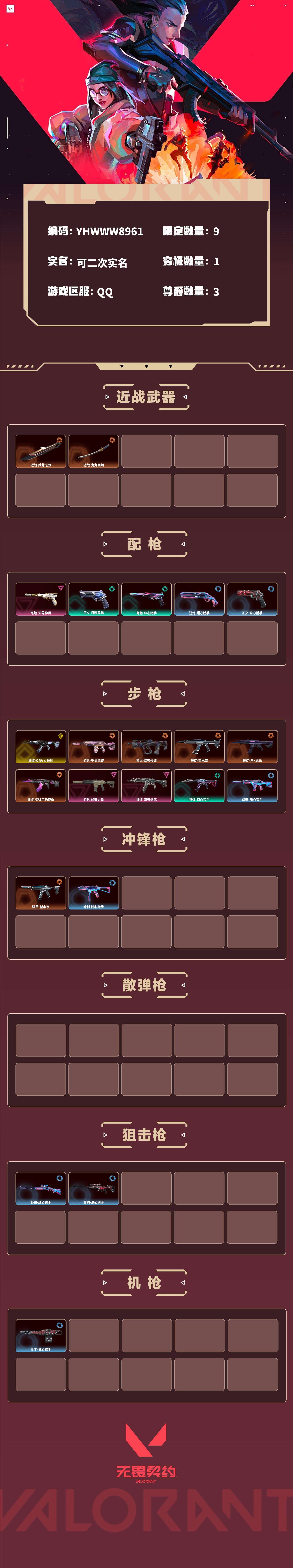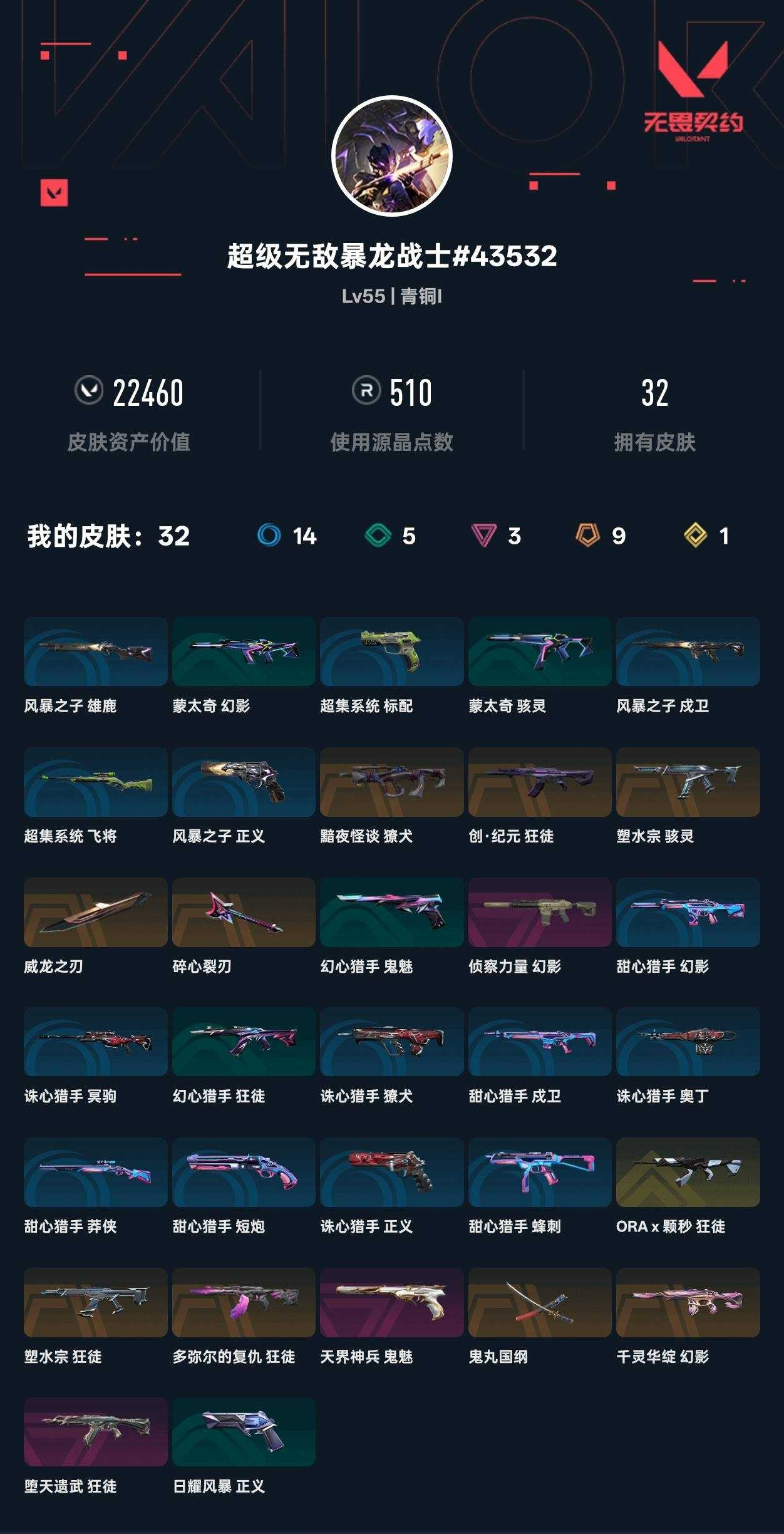 【无畏契约】【yhwww8961】等级:55,已用无畏点22460,已用源晶点510,橙皮:幻影-千灵华绽|骇灵-塑水宗|近战-威龙之刃|獠犬-黯夜怪谈|狂徒-塑水宗|近战-鬼丸国纲|狂徒-创·纪元|狂徒-多弥尔的复仇__紫皮:鬼魅-天界神兵|幻影-侦察力量|狂徒-堕天遗武__段位:青铜__绿皮:正义-日耀风暴|狂徒-幻心猎手|鬼魅-幻心猎手__英雄:尚勃勒|黑梦|斯凯|暮蝶|盖可|壹决|k/o|幽影|炼狱|铁臂|贤者|猎枭|芮娜|零|捷风|不死鸟|幻棱|雷兹|禁灭__蓝皮:蜂刺-甜心猎手|短炮-甜心猎手|莽侠-甜心猎手|幻影-甜心猎手|戍卫-甜心猎手|正义-诛心猎手|冥驹-诛心猎手|獠犬-诛心猎手|奥丁-诛心猎手__金皮:狂徒-a x 颗秒
