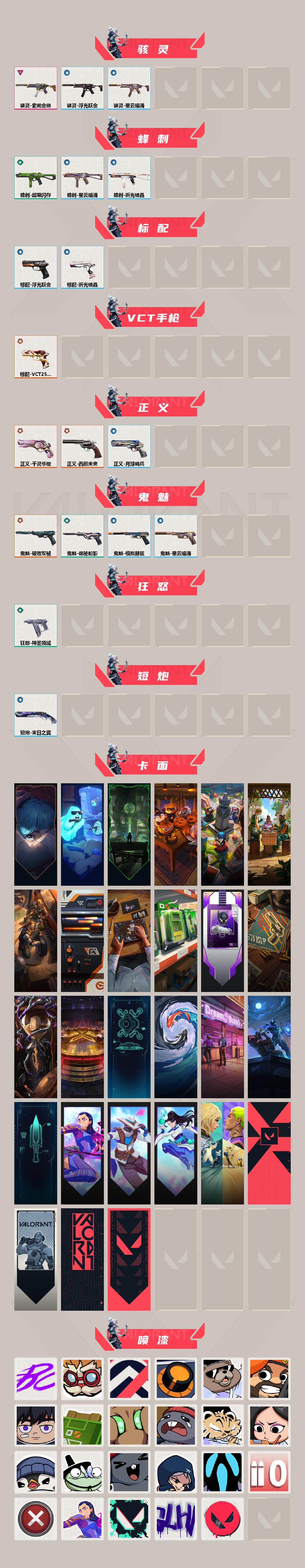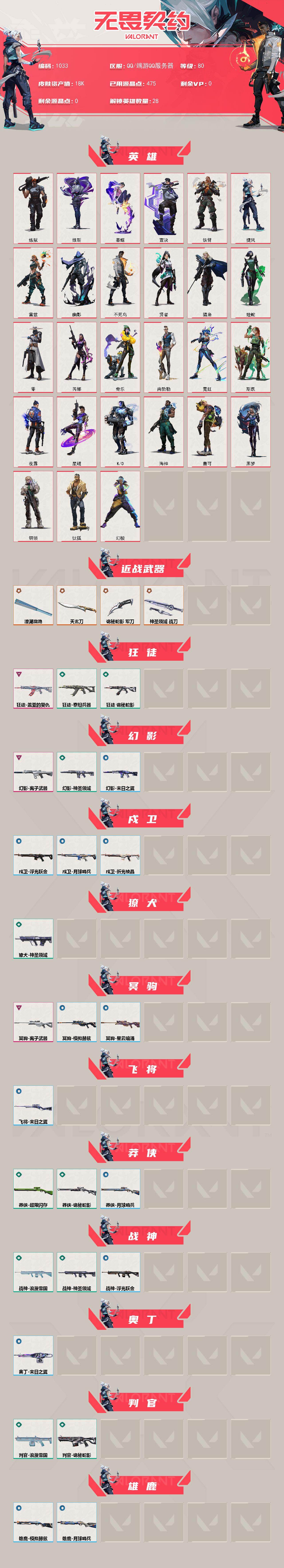 [16337141]【英雄】:幻棱,炼狱,维斯,暮蝶,钛狐,壹决,铁臂,捷风,雷兹,幽影,不死鸟,贤者,猎枭,蝰蛇,零,芮娜,奇乐,尚勃勒,霓虹,斯凯,夜露,星礈,k/o,海神,盖可,黑梦,钢锁 【近战武器】:近战武器-澄湖潋滟,近战武器-天玄刀,近战武器-诡秘蛇影 军刀,近战武器-神圣领域 战刀 【狂徒】:狂徒-盖亚的复仇,狂徒-泰坦兵器,狂徒-诡秘蛇影 【幻影】:幻影-离子武器,幻影-神圣领域,幻影-末日之翼 【戍卫】:戍卫-浮光跃金,戍卫-月球哨兵,戍卫-折光棱晶 【獠犬】:獠犬-神圣领域 【冥驹】:冥驹-离子武器,冥驹-模拟赫兹,冥驹-星云暗涌 【飞将】:飞将-末日之翼 【莽侠】:莽侠-超限闪存,莽侠-诡秘蛇影,莽侠-月球哨兵 【战神】:战神-浪漫雪国,战神-神圣领域,战神-浮光跃金 【奥丁】:奥丁-末日之翼 【判官】:判官-浪漫雪国,判官-诡秘蛇影 【雄鹿】:雄鹿-模拟赫兹,雄鹿-月球哨兵 【骇灵】:骇灵-紫阙金琅,骇灵-浮光跃金,骇灵-星云暗涌 【蜂刺】:蜂刺-超限闪存,蜂刺-星云暗涌,蜂刺-折光棱晶 【标配】:标配-浮光跃金,标配-折光棱晶 【vct手呛】:标配-vct25 x edg 【正义】:正义-千灵华绽,正义-西部未来,正义-月球哨兵 【鬼魅】:鬼魅-破败军械,鬼魅-诡秘蛇影,鬼魅-模拟赫兹,鬼魅-星云暗涌 【狂怒】:狂怒-神圣领域 【短炮】:短炮-末日之翼 【卡面】:《双城之战》拥抱 卡面,精灵大战 卡面,欢迎来到底城 卡面,南瓜盛典 卡面,战术桌游 卡面,悠享食光 卡面,修车达人 卡面,模拟赫兹 卡面,浮光跃金 卡面,超限闪存 卡面,维斯工牌 卡面,正义的化身 卡面,时间到 卡面,最高舞台 卡面,声感陷阱设计图 卡面,红鳞松叶 卡面,梦幻奶茶 卡面,失控边缘 卡面,零点嗅探设计图 卡面,无畏契约go!第一卷:芮娜 卡面,无畏契约go!第一卷:零 卡面,无畏契约go!第一卷:贤者 卡面,钢锁vs盖可 卡面,代号红色 卡面,新兵报到 卡面,v契约 卡面,无畏契约 卡面 【喷漆】:嘭! 喷漆,都算到了 喷漆,控场勿近 喷漆,模拟赫兹 喷漆,高丽风情小熊 喷漆,蹲到一个 喷漆,全力集中 喷漆,超限闪存 喷漆,rua一下 喷漆,熊抱 喷漆,高丽风情小虎 喷漆,记在小本本 喷漆,防弹企鹅 喷漆,高丽风情小蛙 喷漆,超级粉丝 喷漆,捷风差距 喷漆,惊声尖叫 喷漆,拼一呛