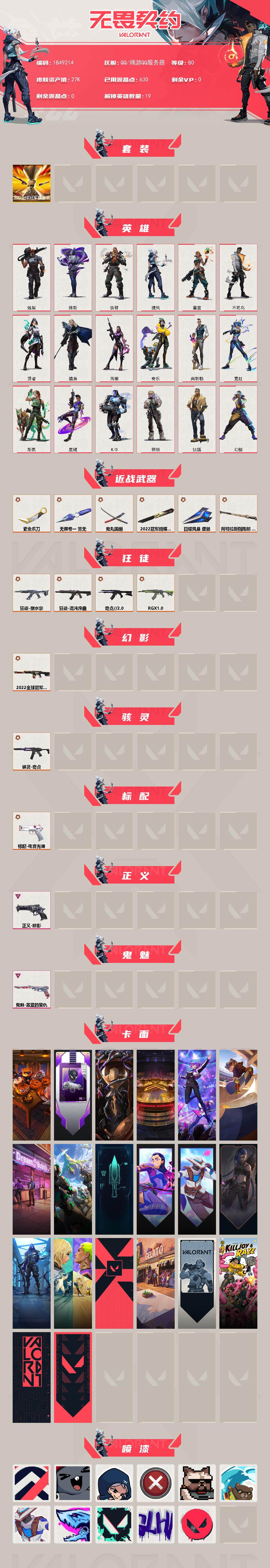 【套装】:w13008 可立即换绑无需挂单养号 2022全球冠军赛套装 【英雄】:幻棱,炼狱,维斯,钛狐,铁臂,捷风,雷兹,不死鸟,贤者,猎枭,芮娜,奇乐,尚勃勒,霓虹,斯凯,星礈,k/o,钢锁 【近战武器】:近战武器-2022全球冠军赛 蝴蝶刀,近战武器-无畏契约go!第一卷 苦无,近战武器-紫金爪刀,近战武器-鬼丸国纲,近战武器-日耀风暴 遗器,近战武器-阿特拉斯指挥部 甩棍 【狂徒】