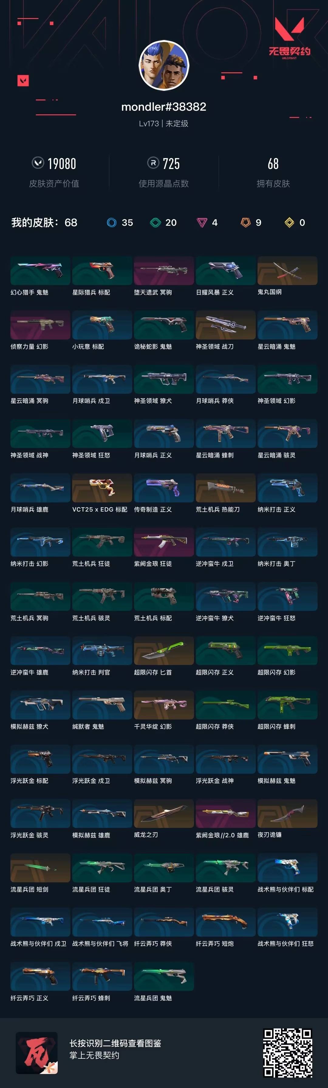 9橙皮 4紫皮 68皮肤 28英雄 130卡面 725已用源晶 未定级段位 【近战武器皮肤】鬼丸国纲神圣领域 战刀荒土机兵热能刀匕首-超限闪存短剑-流星兵团夜刃诡镰威龙之刃 【佩呛皮肤】标配-vct25xedg 【霰弹呛皮肤】雄鹿-紫阙金琅2.0 【步呛皮肤】狂徒-紫阙金琅幻影-侦察