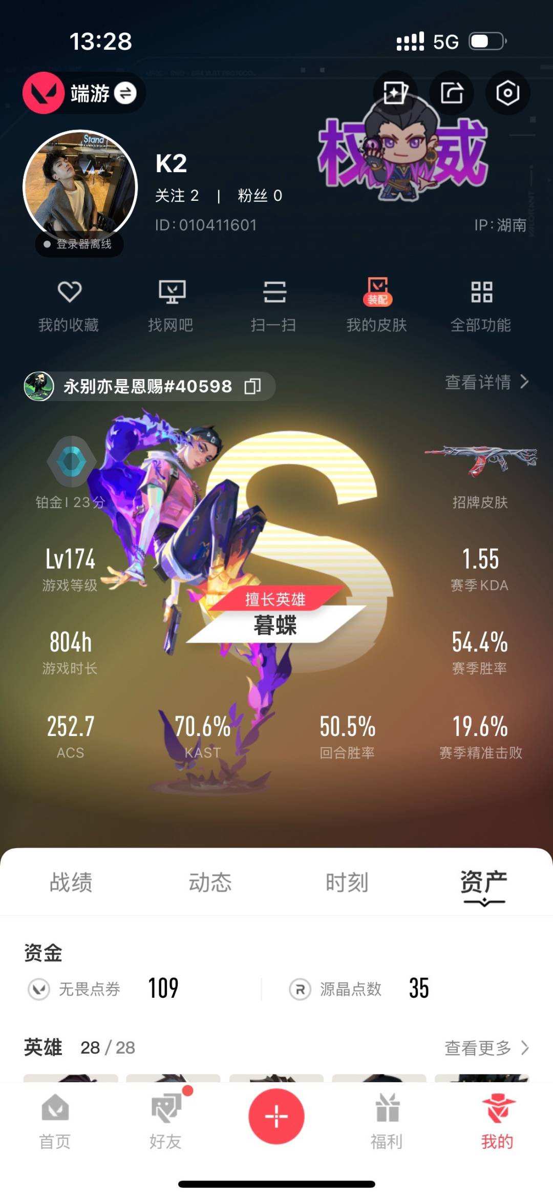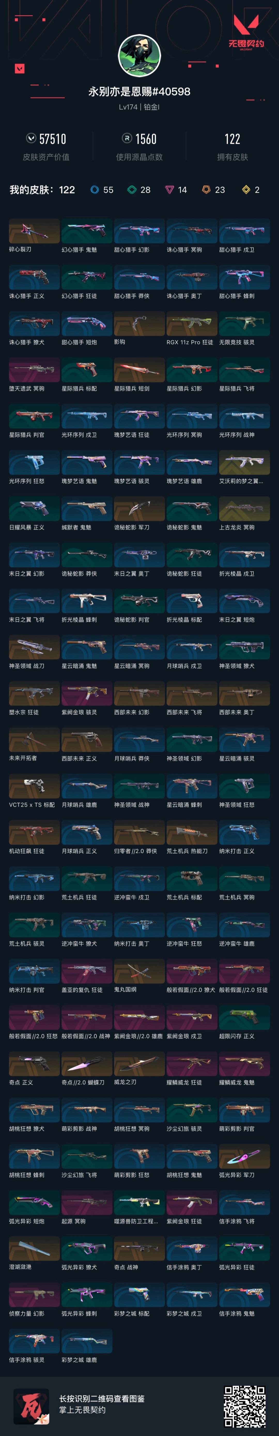 23橙皮 2金皮 14紫皮 122皮肤 28英雄 169卡面 1560已用源晶 铂金段位 【套装】:般若假面//2.0套装西部未来耀鳞威龙套装曲奇套装 【近战武器皮肤】:鬼丸国纲未来开拓者神圣领域 战刀荒土机兵热能刀诡秘蛇影蝴蝶刀-奇点//2.0星际猎兵 短剑碎心裂刃影钩威