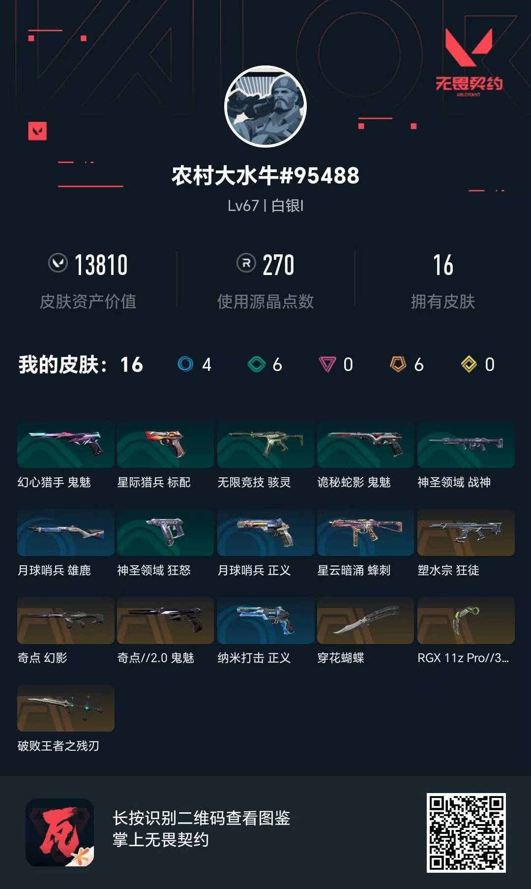 6橙皮 16皮肤 19英雄 50卡面 270已用源晶 白银段位 【近战武器皮肤】穿花蝴蝶爪刀-rgx 11z pro 3.0破败王者之残刃 【佩呛皮肤】鬼魅-奇点//2.0 【步呛皮肤】狂徒-塑水宗幻影-奇点 【挂饰】神中神挂饰v26第一幕纪念币 挂饰