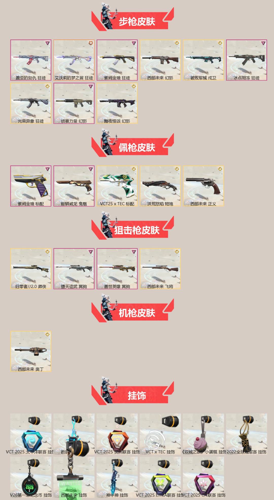 22橙皮 1金皮 8紫皮 112皮肤 28英雄 149卡面 1085已用源晶 白银段位 【亮点皮肤】幻影-2022全球冠军赛蝴蝶刀-2022全球冠军赛 【套装】vcn2025套装西部未来vct 2025赛季礼包2022全球冠军赛 【近战武器皮肤】日耀风暴 遗器阿特拉斯指挥部蝴蝶刀-