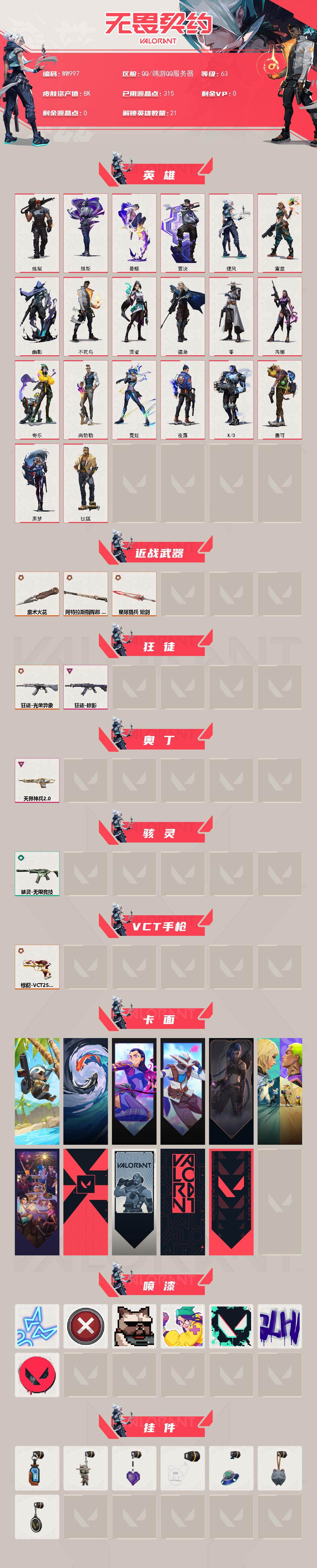 【ww997】终极5/卓越2/皮肤32/等级63/段位:未定级/炼狱/维斯/暮蝶/钛狐/壹决/捷风/雷兹/幽影/不死鸟/贤者/猎枭/零/芮娜/奇乐/尚勃勒/霓虹/夜露/k/o/盖可/黑梦/近战武器-魔术火花/近战武器-阿特拉斯指挥部 甩棍/近战武器-星际猎兵 短剑/狂徒-光荣异象/狂徒-掠影/奥丁-天界神兵//2.0/骇灵-无限竞技/标配-vct25 x edg/树懒大作战 卡面/红鳞松叶 卡面/无畏契约go!第一卷:芮娜 卡面/无畏契约go!第一卷:零 卡面/《双城之战》金克丝 卡面/钢锁vs盖可 卡面/天台狂欢 卡面/代号红色 卡面/新兵报到 卡面/v契约 卡面/无畏契约 卡面/霓光四射 喷漆/买装还是存钱 喷漆/关门放狗 喷漆/无畏契约go!第一卷:奇乐 喷漆/胜利属于无畏契约 喷漆/glhf 喷漆/无畏契约 喷漆/纳米打击 挂饰/无畏契约go!第一卷 零 挂饰/薰衣草之心 挂饰/vct x edg 挂饰/天外飞客 挂饰/《双城之战》魄罗 挂饰/无畏契约 纪念币 挂饰