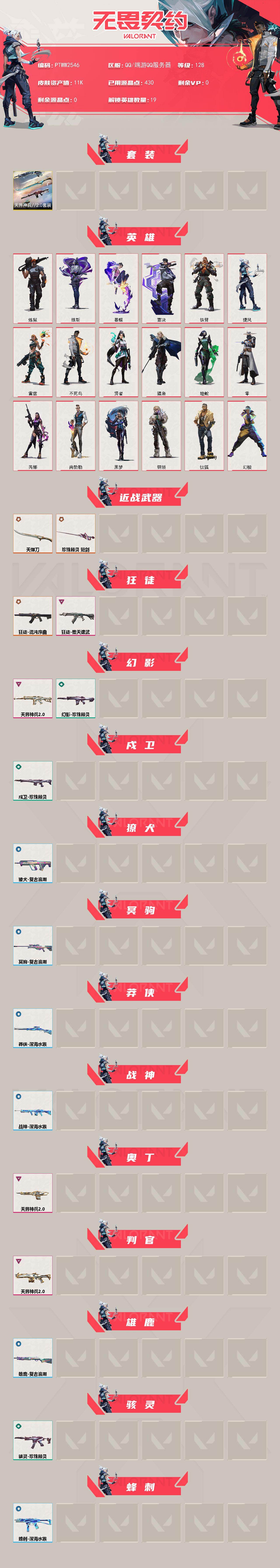 【套装】:天界神兵//2.0套装 【英雄】:幻棱,炼狱,维斯,暮蝶,钛狐,壹决,铁臂,捷风,雷兹,不死鸟,贤者,猎枭,蝰蛇,零,芮娜,尚勃勒,黑梦,钢锁 【近战武器】:近战武器-珍珠棘贝 短剑,近战武器-天御刀 【狂徒】:狂徒-混沌序曲,狂徒-堕天遗武 【幻影】:幻影-天界神兵//2.0,幻影-珍珠棘贝 【戍卫】:戍卫-珍珠棘贝 【獠犬】:獠犬-复古浪潮 【冥驹】:冥驹-复古浪潮 【莽侠】:莽
