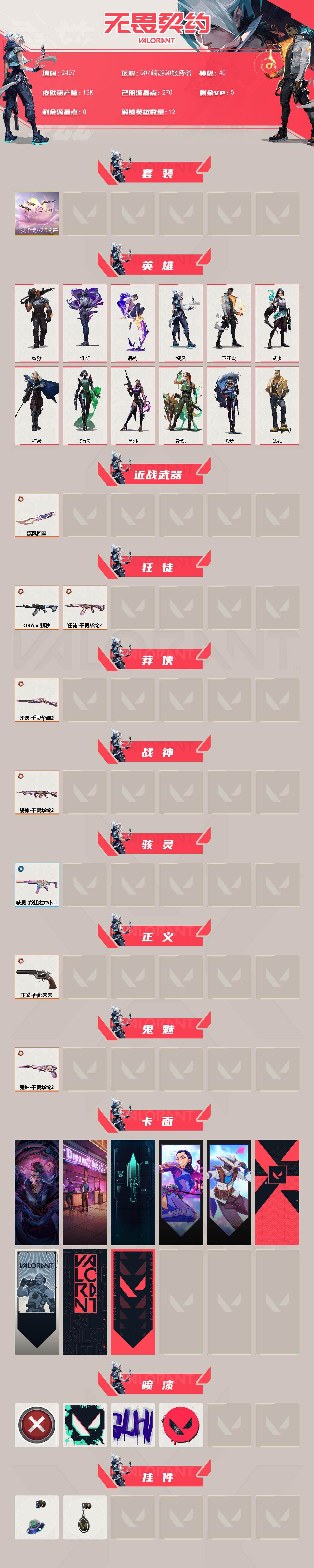 [16350069]【套装】:千灵华绽//2.0套装 【英雄】:炼狱,维斯,暮蝶,钛狐,捷风,不死鸟,贤者,猎枭,蝰蛇,芮娜,斯凯,黑梦 【近战武器】:近战武器-流风回雪 【狂徒】:狂徒-a x 颗秒,狂徒-千灵华绽//2.0 【莽侠】:莽侠-千灵华绽//2.0 【战神】:战神-千灵华绽//2.0 【骇灵】:骇灵-彩虹魔力小白马 【正义】:正义-西部未来 【鬼魅】:鬼魅-千灵华绽//2.0 【卡面】:分崩离析 卡面,梦幻奶茶 卡面,零点嗅探设计图 卡面,无畏契约go!第一卷:芮娜 卡面,无畏契约go!第一卷:零 卡面,代号红色 卡面,新兵报到 卡面,v契约 卡面,无畏契约 卡面 【喷漆】:买装还是存钱 喷漆,胜利属于无畏契约 喷漆,glhf 喷漆,无畏契约 喷漆 【挂饰】:天外飞客 挂饰,无畏契约 纪念币 挂饰
