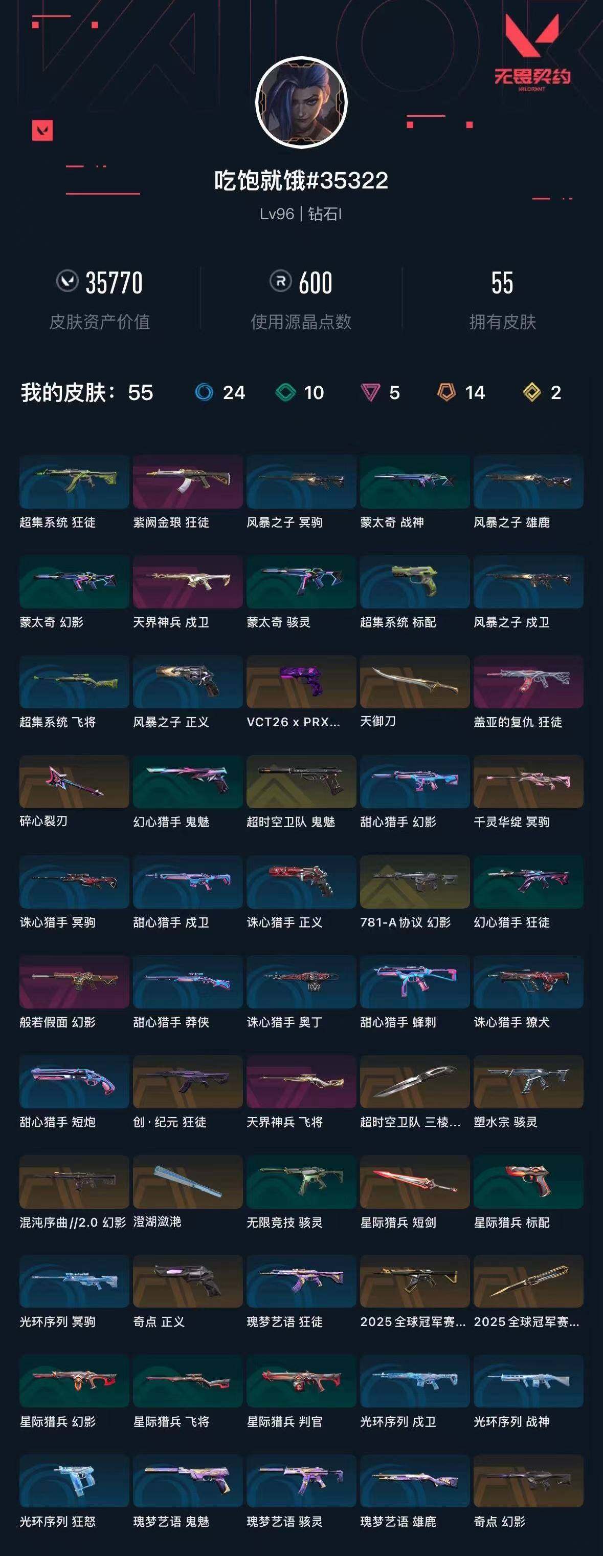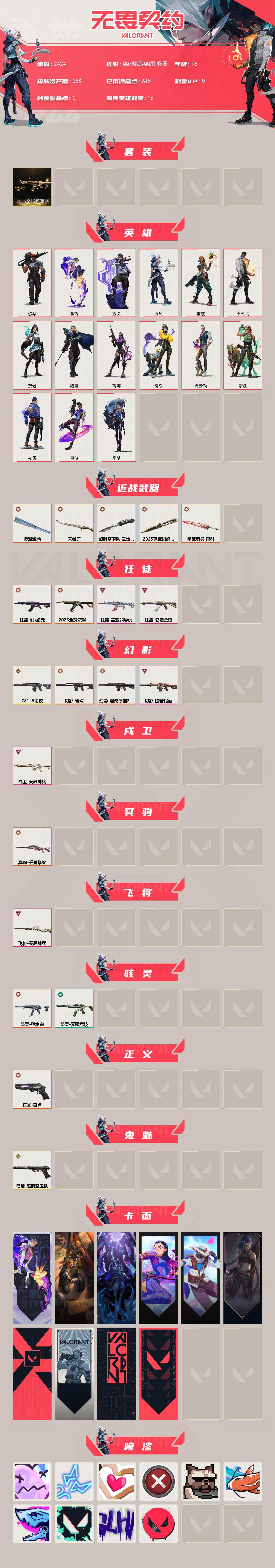[16350912]【套装】:2025全球冠军赛套装 【英雄】:炼狱,暮蝶,壹决,捷风,雷兹,不死鸟,贤者,猎枭,芮娜,奇乐,尚勃勒,斯凯,夜露,星礈,黑梦 【近战武器】:近战武器-2025全球冠军赛 蝴蝶刀,近战武器-超时空卫队 三棱军刺,近战武器-澄湖潋滟,近战武器-天御刀,近战武器-星际猎兵 短剑 【狂徒】:狂徒-2025全球冠军赛,狂徒-创·纪元,狂徒-盖亚的复仇,狂徒-紫阙金琅 【幻影】:幻影-781-a协议,幻影-奇点,幻影-混沌序曲//2.0,幻影-般若假面 【戍卫】:戍卫-天界神兵 【冥驹】:冥驹-千灵华绽 【飞将】:飞将-天界神兵 【骇灵】:骇灵-塑水宗,骇灵-无限竞技 【正义】:正义-奇点 【鬼魅】:鬼魅-超时空卫队 【卡面】:无畏契约:暮蝶 卡面,修车达人 卡面,失而复得 卡面,无畏契约go!第一卷:芮娜 卡面,无畏契约go!第一卷:零 卡面,《双城之战》金克丝 卡面,代号红色 卡面,新兵报到 卡面,v契约 卡面,无畏契约 卡面 【喷漆】:伤心心 喷漆,霓光四射 喷漆,双人比心 喷漆,买装还是存钱 喷漆,关门放狗 喷漆,红鳞 喷漆,暴走萝莉 喷漆,胜利属于无畏契约 喷漆,glhf 喷漆,无畏契约 喷漆 【挂饰】:无畏契约go!第一卷 零 挂饰,传世莲华 挂饰,天外飞客 挂饰,无畏契约 纪念币 挂饰