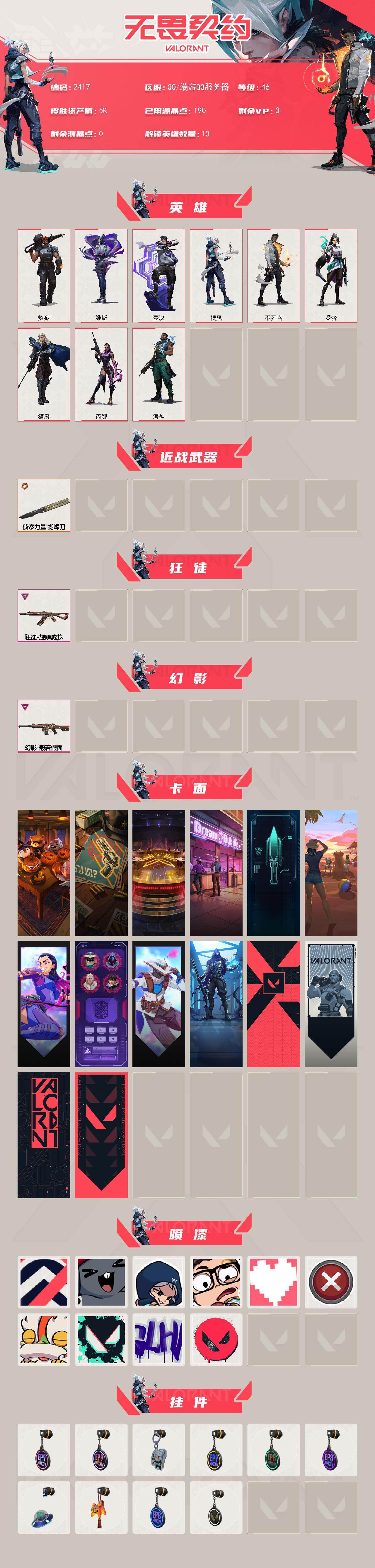 [16351758]【英雄】:炼狱,维斯,壹决,捷风,不死鸟,贤者,猎枭,芮娜,海神 【近战武器】:近战武器-侦察力量 蝴蝶刀 【狂徒】:狂徒-耀鳞威龙 【幻影】:幻影-般若假面 【卡面】:南瓜盛典 卡面,正义的化身 卡面,最高舞台 卡面,梦幻奶茶 卡面,零点嗅探设计图 卡面,沙雕爆能器 卡面,无畏契约go!第一卷:芮娜 卡面,清除名单 卡面,无畏契约go!第一卷:零 卡面,暗呛 卡面,代号红色 卡面,新兵报到 卡面,v契约 卡面,无畏契约 卡面 【喷漆】:控场勿近 喷漆,超级粉丝 喷漆,捷风差距 喷漆,新潮流 喷漆,双击点赞 喷漆,买装还是存钱 喷漆,醒狮贺春 喷漆,胜利属于无畏契约 喷漆,glhf 喷漆,无畏契约 喷漆 【挂饰】:第九季//第三幕 纪念币 挂饰,第九季//第二幕 纪念币 挂饰,袖珍捷风 挂饰,第九季//第一幕 纪念币 挂饰,第八季//第三幕 纪念币 挂饰,第八季//第二幕 纪念币 挂饰 ,天外飞客 挂饰,好运福爪 挂饰,第八季//第一幕 纪念币 挂饰,无畏契约 纪念币 挂饰