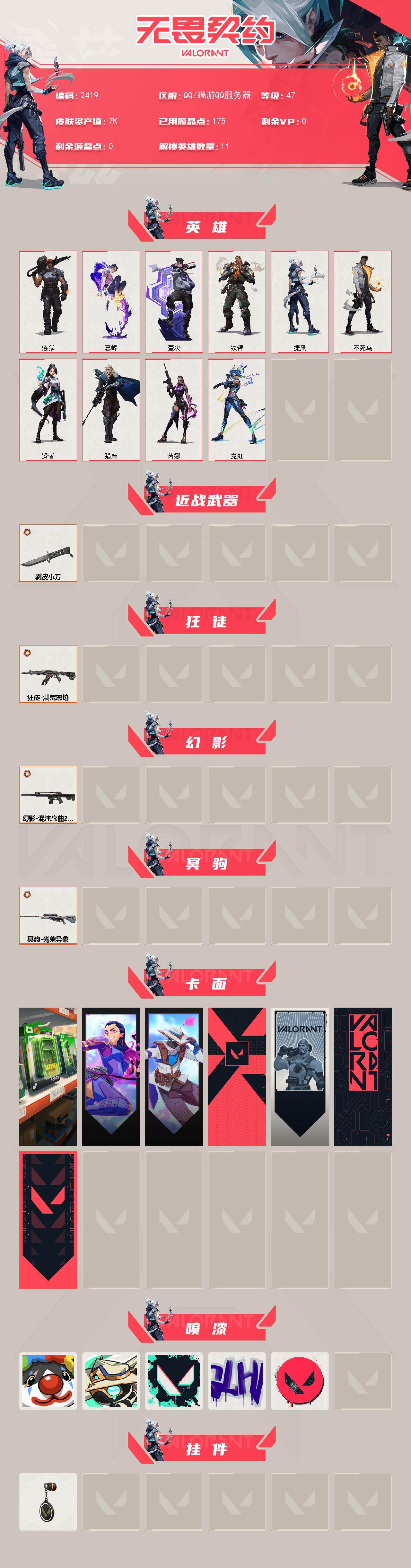 [16352116]【英雄】:炼狱,暮蝶,壹决,铁臂,捷风,不死鸟,贤者,猎枭,芮娜,霓虹 【近战武器】:近战武器-剥皮小刀 【狂徒】:狂徒-洪荒怒焰 【幻影】:幻影-混沌序曲//2.0 【冥驹】:冥驹-光荣异象 【卡面】:超限闪存 卡面,无畏契约go!第一卷:芮娜 卡面,无畏契约go!第一卷:零 卡面,代号红色 卡面,新兵报到 卡面,v契约 卡面,无畏契约 卡面 【喷漆】:小丑猫 喷漆,再吃最后一口 喷漆,胜利属于无畏契约 喷漆,glhf 喷漆,无畏契约 喷漆 【挂饰】:无畏契约 纪念币 挂饰