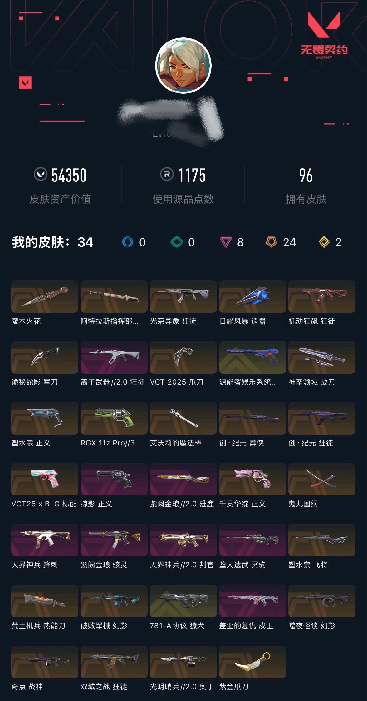 【无畏契约】【yhwww8988】等级:160,已用无畏点54350,已用源晶点1175,金皮:獠犬-781-a协议|鬼魅-源能者娱乐系统__橙皮:奥丁-光明哨兵2.0|飞将-塑水宗|幻影-黯夜怪谈|幻影-破败军械|近战-艾沃莉的魔法棒|近战-紫金爪刀|狂徒-机动狂飙|正义-塑水宗|正义-rgx 11z pro3.0|战神-奇点|正义-千灵华绽|近战-荒土机兵 热能刀|狂徒-双城之战|近战-鬼丸国纲|莽侠-创·纪元|狂徒-创·纪元|近战-神圣领域 战刀|标配-vct25 x blg|近战-vct 2025 爪刀|近战-诡秘蛇影 军刀|狂徒-光荣异象|近战-日耀风暴 遗器|近战-阿特拉斯指挥部 甩棍|近战-魔术火花__紫皮:蜂刺-天界神兵|骇灵-紫阙金琅|冥驹-堕天遗武|判官-天界神兵2.0|戍卫-盖亚的复仇|雄鹿-紫阙金琅2.0|正义-掠影|狂徒-离子武器2.0__段位:未定级__蓝皮:判官-纳米打击|正义-纳米打击|奥丁-纳米打击|幻影-纳米打击|雄鹿-逆冲蛮牛|狂怒-逆冲蛮牛|戍卫-逆冲蛮牛|獠犬-逆冲蛮牛|鬼魅-星云暗涌|骇灵-星云暗涌|正义-月球哨兵|莽侠-月球哨兵|戍卫-月球哨兵|雄鹿-月球哨兵|狂徒-彩虹魔力小白马|冥驹-星云暗涌|蜂刺-星云暗涌|蜂刺-折光棱晶|戍卫-折光棱晶|标配-折光棱晶|飞将-末日之翼|幻影-末日之翼|短炮-末日之翼|奥丁-末日之翼|鬼魅-甜蜜战术|判官-甜蜜战术|戍卫-甜蜜战术|雄鹿-幻语魔咒|獠犬-幻语魔咒|飞将-幻语魔咒|狂怒-幻语魔咒|正义-太空穿梭|战神-太空穿梭|判官-太空穿梭|戍卫-太空穿梭|骇灵-阿特拉斯指挥部|莽侠-阿特拉斯指挥部|标配-阿特拉斯指挥部|狂徒-阿特拉斯指挥部__绿皮:狂徒-荒土机兵|标配-荒土机兵|骇灵-荒土机兵|冥驹-荒土机兵|獠犬-神圣领域|狂怒-神圣领域|战神-神圣领域|幻影-神圣领域|判官-诡秘蛇影|鬼魅-诡秘蛇影|莽侠-诡秘蛇影|狂徒-诡秘蛇影|正义-日耀风暴|幻影-日耀风暴|奥丁-日耀风暴|短炮-悠闲猫生|飞将-悠闲猫生|幻影-悠闲猫生|獠犬-悠闲猫生|标配-星际猎兵|鬼魅-幻心猎手__英雄:尚勃勒|维斯|黑梦|斯凯|暮蝶|盖可|霓虹|壹决|星礈|k/o|幽影|夜露|钢锁|海神|奇乐|炼狱|铁臂|贤者|猎枭|钛狐|芮娜|零|捷风|蝰蛇|不死鸟|幻棱|雷兹|禁灭