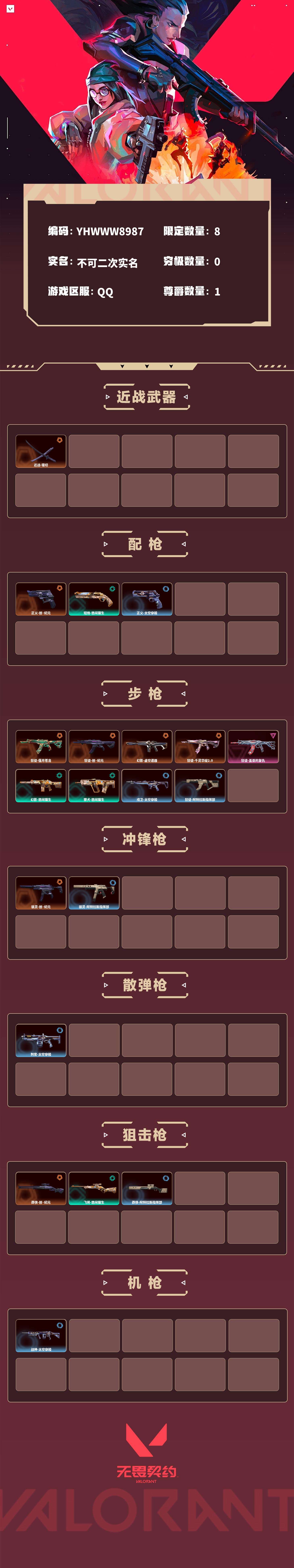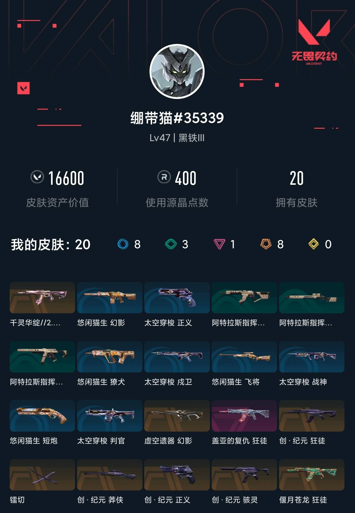 【无畏契约】【yhwww8987】等级:47,已用无畏点16600,已用源晶点400,橙皮:狂徒-偃月苍龙|近战-镭切|骇灵-创·纪元|莽侠-创·纪元|狂徒-创·纪元|正义-创·纪元|幻影-虚空遗器|狂徒-千灵华绽2.0__紫皮:狂徒-盖亚的复仇__段位:黑铁__蓝皮:正义-太空穿梭|战神-太空穿梭|判官-太空穿梭|戍卫-太空穿梭|骇灵-阿特拉斯指挥部|莽侠-阿特拉斯指挥部|狂徒-阿特拉斯指挥部__绿皮:短炮-悠闲猫生|飞将-悠闲猫生|幻影-悠闲猫生|獠犬-悠闲猫生__英雄:尚勃勒|维斯|暮蝶|壹决|幽影|炼狱|铁臂|贤者|猎枭|零|捷风|不死鸟|幻棱