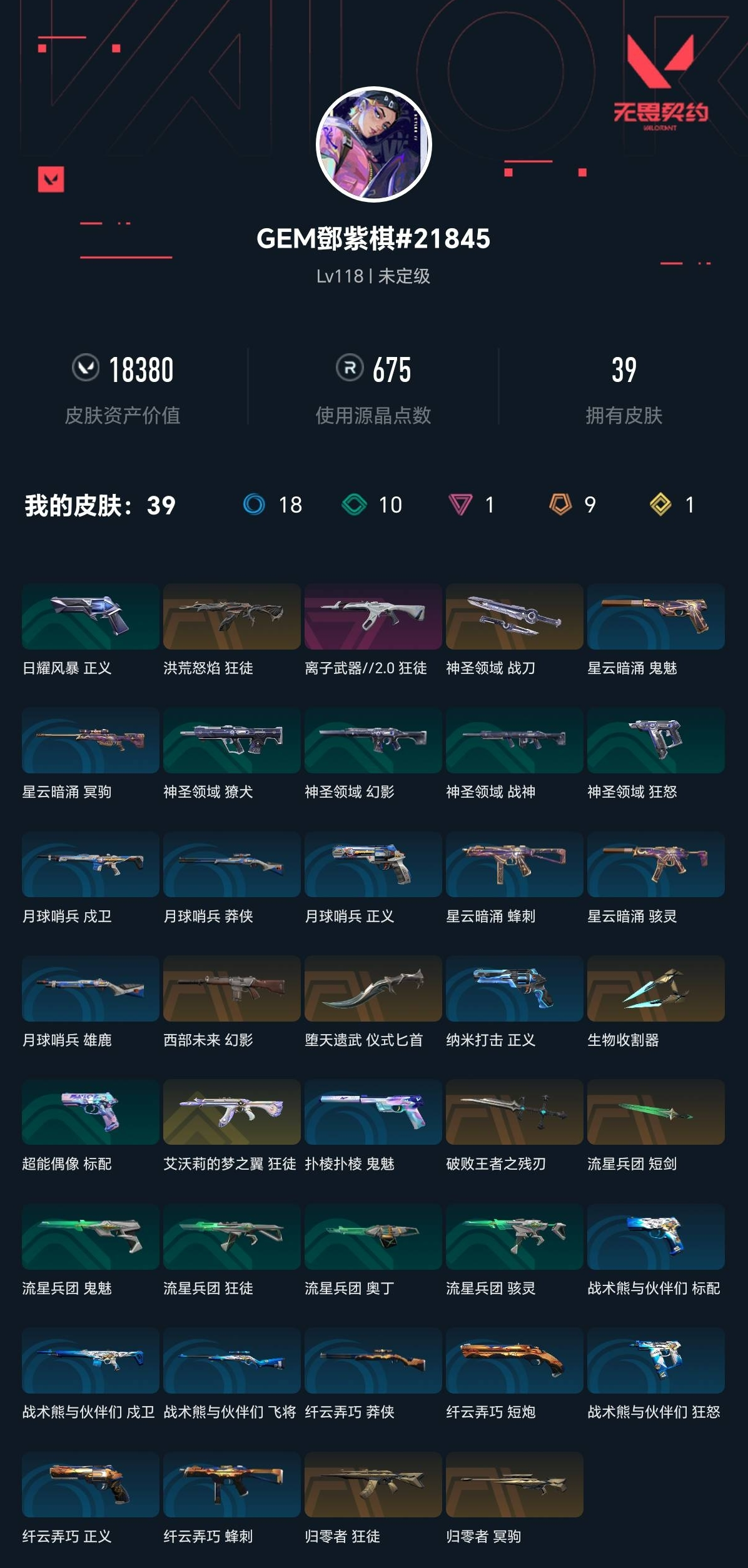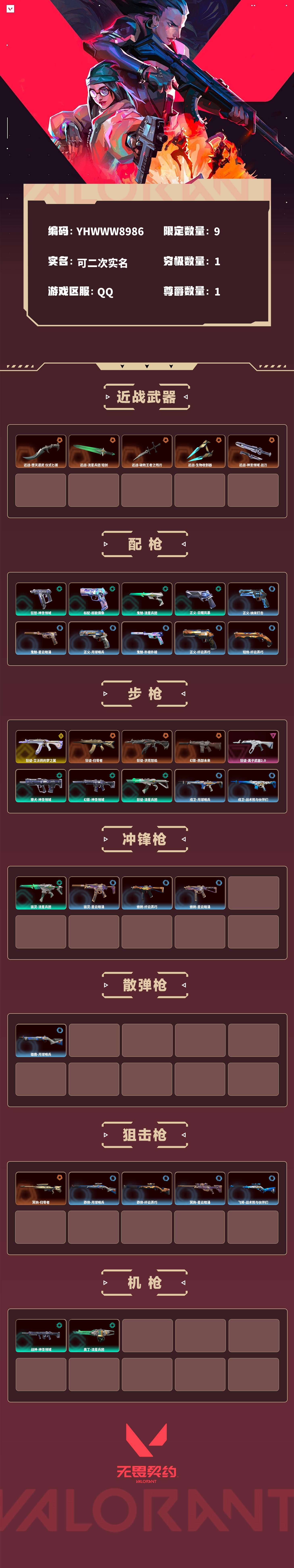 【无畏契约】【yhwww8986】等级:118,已用无畏点18380,已用源晶点675,金皮:狂徒-艾沃莉的梦之翼__橙皮:近战-堕天遗武 仪式匕首|近战-流星兵团 短剑|近战-破败王者之残刃|近战-生物收割器|狂徒-归零者|狂徒-洪荒怒焰|冥驹-归零者|近战-神圣领域 战刀|幻影-西部未来__段位:未定级__蓝皮:正义-纳米打击|鬼魅-星云暗涌|骇灵-星云暗涌|正义-月球哨兵|莽侠-月球哨兵|戍卫-月球哨兵|雄鹿-月球哨兵|鬼魅-扑棱扑棱|莽侠-纤云弄巧|正义-纤云弄巧|短炮-纤云弄巧|蜂刺-纤云弄巧|冥驹-星云暗涌|蜂刺-星云暗涌|飞将-战术熊与伙伴们|狂怒-战术熊与伙伴们|戍卫-战术熊与伙伴们|标配-战术熊与伙伴们__绿皮:獠犬-神圣领域|狂怒-神圣领域|战神-神圣领域|幻影-神圣领域|标配-超能偶像|骇灵-流星兵团|鬼魅-流星兵团|狂徒-流星兵团|奥丁-流星兵团|正义-日耀风暴__紫皮:狂徒-离子武器2.0__英雄:尚勃勒|维斯|黑梦|斯凯|暮蝶|盖可|霓虹|壹决|星礈|幽影|夜露|钢锁|海神|炼狱|贤者|猎枭|钛狐|芮娜|零|捷风|蝰蛇|不死鸟|幻棱|雷兹