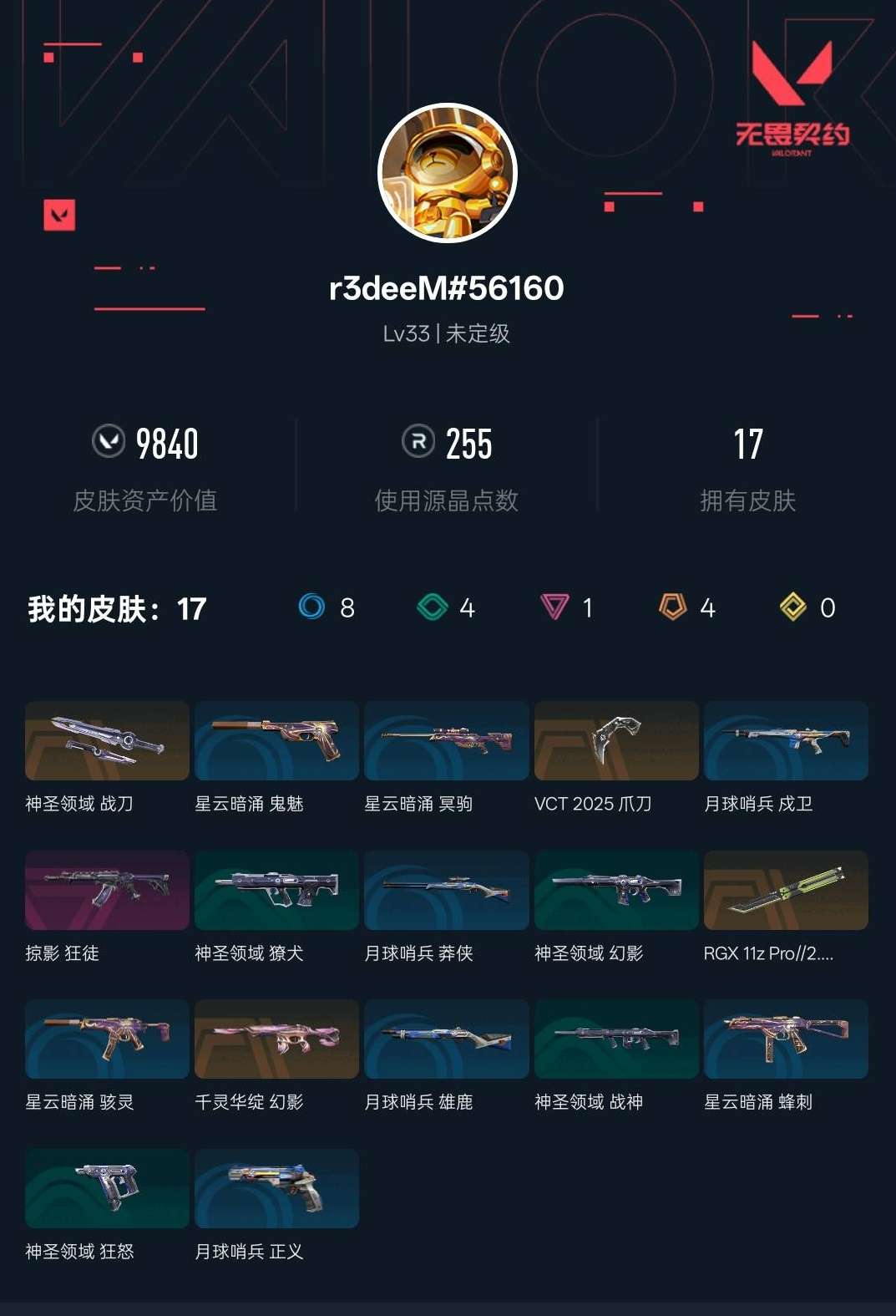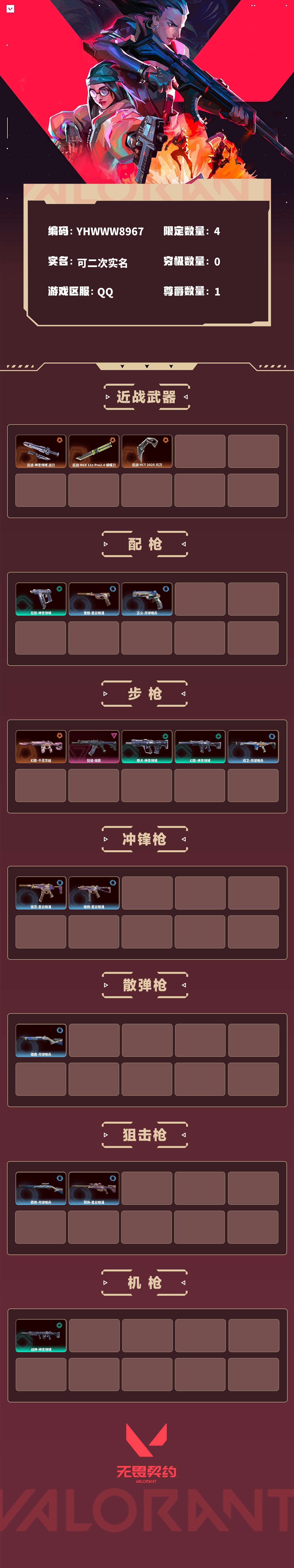 【无畏契约】【yhwww8967】等级:33,已用无畏点9840,已用源晶点255,橙皮:幻影-千灵华绽|近战-神圣领域 战刀|近战-rgx 11z pro2.0 蝴蝶刀|近战-vct 2025 爪刀__段位:未定级__紫皮:狂徒-掠影__蓝皮:鬼魅-星云暗涌|骇灵-星云暗涌|正义-月球哨兵|莽侠-月球哨兵|戍卫-月球哨兵|雄鹿-月球哨兵|冥驹-星云暗涌|蜂刺-星云暗涌__绿皮:獠犬-神圣领域|狂怒-神圣领域|战神-神圣领域|幻影-神圣领域__英雄:斯凯|暮蝶|盖可|k/o|夜露|炼狱|铁臂|贤者|猎枭|钛狐|芮娜|零|捷风|不死鸟