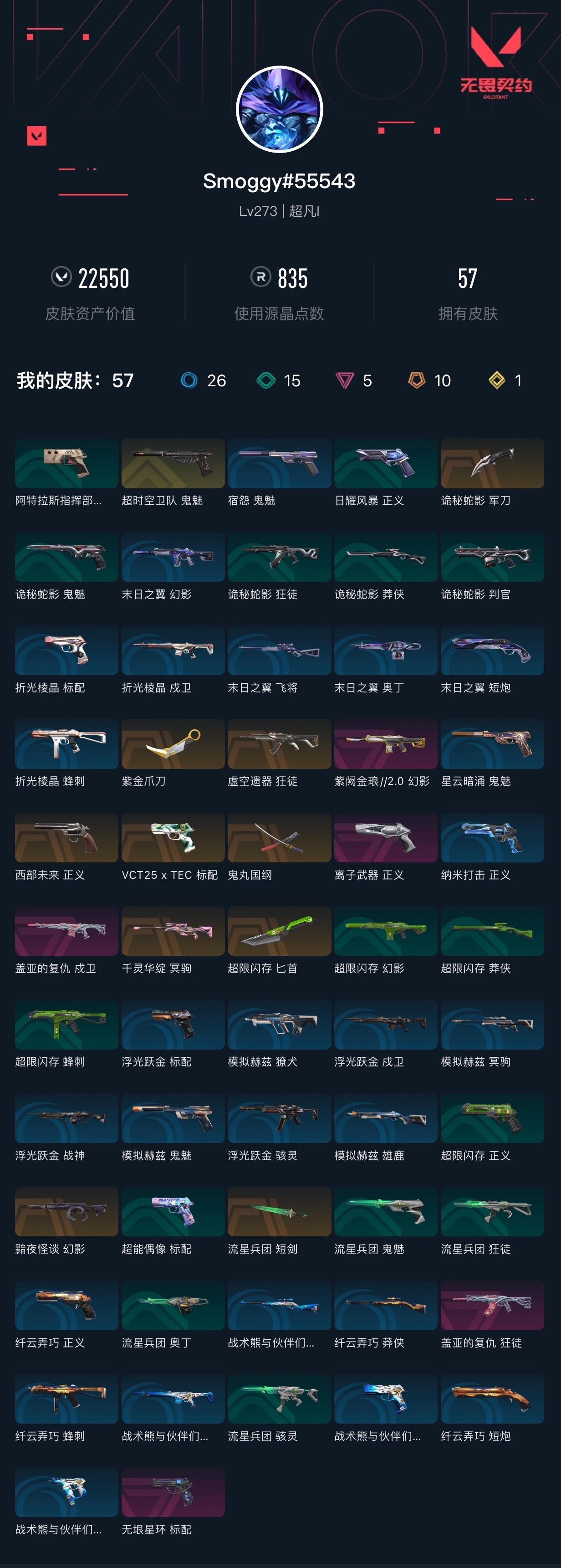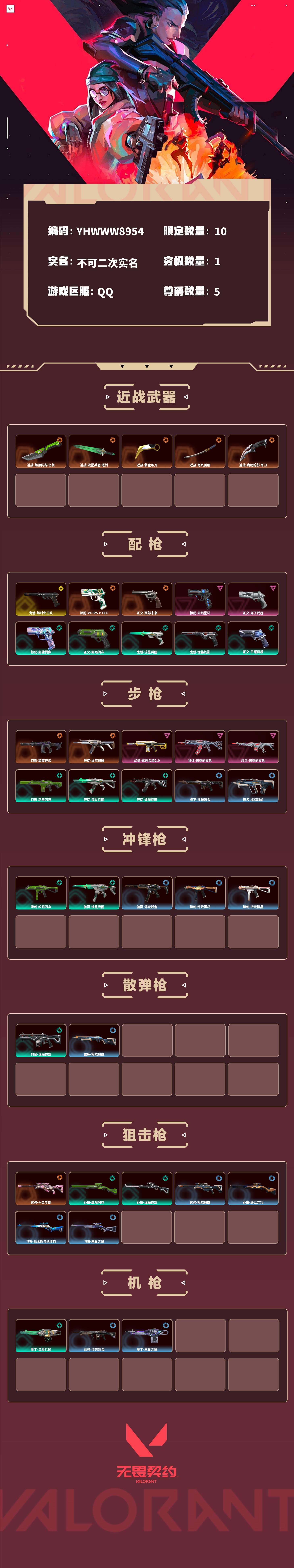 【无畏契约】【yhwww8954】等级:273,已用无畏点22550,已用源晶点835,橙皮:幻影-黯夜怪谈|近战-超限闪存 匕首|近战-流星兵团 短剑|近战-紫金爪刀|冥驹-千灵华绽|近战-鬼丸国纲|标配-vct25 x tec|正义-西部未来|狂徒-虚空遗器|近战-诡秘蛇影 军刀__紫皮:标配-无垠星环|幻影-紫阙金琅2.0|狂徒-盖亚的复仇|戍卫-盖亚的复仇|正义-离子武器__段位:超凡__蓝皮:鬼魅-宿怨|正义-纳米打击|鬼魅-星云暗涌|骇灵-浮光跃金|标配-浮光跃金|戍卫-浮光跃金|战神-浮光跃金|鬼魅-模拟赫兹|獠犬-模拟赫兹|冥驹-模拟赫兹|雄鹿-模拟赫兹|莽侠-纤云弄巧|正义-纤云弄巧|短炮-纤云弄巧|蜂刺-纤云弄巧|飞将-战术熊与伙伴们|狂怒-战术熊与伙伴们|戍卫-战术熊与伙伴们|标配-战术熊与伙伴们|蜂刺-折光棱晶|戍卫-折光棱晶|标配-折光棱晶|飞将-末日之翼|幻影-末日之翼|短炮-末日之翼|奥丁-末日之翼|标配-阿特拉斯指挥部__绿皮:标配-超能偶像|正义-超限闪存|莽侠-超限闪存|幻影-超限闪存|蜂刺-超限闪存|骇灵-流星兵团|鬼魅-流星兵团|狂徒-流星兵团|奥丁-流星兵团|判官-诡秘蛇影|鬼魅-诡秘蛇影|莽侠-诡秘蛇影|狂徒-诡秘蛇影|正义-日耀风暴__金皮:鬼魅-超时空卫队__英雄:尚勃勒|维斯|黑梦|斯凯|暮蝶|盖可|霓虹|壹决|星礈|k/o|幽影|夜露|钢锁|奇乐|炼狱|铁臂|贤者|猎枭|钛狐|芮娜|零|捷风|蝰蛇|不死鸟|幻棱|雷兹