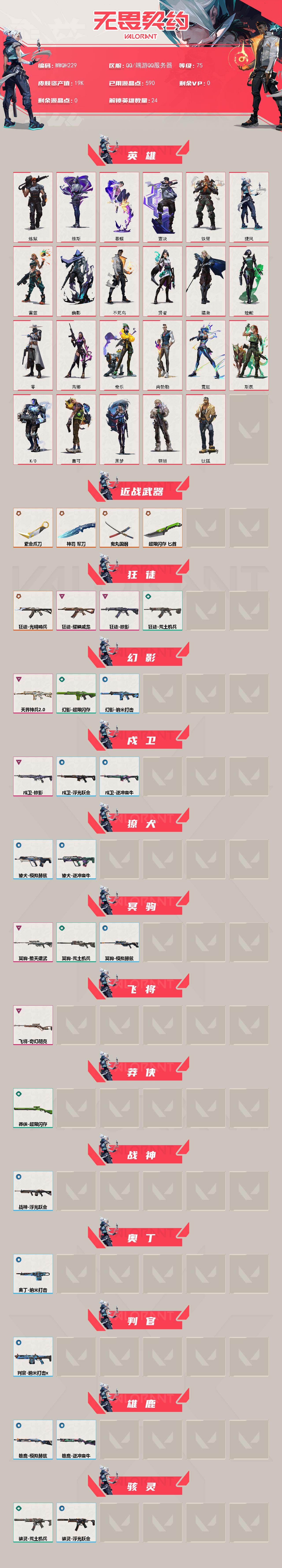【wwqh229】终极6/卓越7/皮肤37/等级75/段位:铂金/炼狱/维斯/暮蝶/钛狐/壹决/铁臂/捷风/雷兹/幽影/不死鸟/贤者/猎枭/蝰蛇/零/芮娜/奇乐/尚勃勒/霓虹/斯凯/k/o/盖可/黑梦/钢锁/近战武器-紫金爪刀/近战武器-鬼丸国纲/近战武器-超限闪存 匕首/近战武器-神罚 军刀/狂徒-光明哨兵/狂徒-掠影/狂徒-耀鳞威龙/狂徒-荒土机兵/幻影-天界神兵//2.0/幻影-超限闪存/幻影-纳米打击/戍卫-掠影/戍卫-浮光跃金/戍卫-逆冲蛮牛/獠犬-模拟赫兹/獠犬-逆冲蛮牛/冥驹-堕天遗武/冥驹-荒土机兵/冥驹-模拟赫兹/飞将-奇幻朋克/莽侠-超限闪存/战神-浮光跃金/奥丁-纳米打击/判官-纳米打击x/雄鹿-模拟赫兹/雄鹿-逆冲蛮牛/骇灵-荒土机兵/骇灵-浮光跃金/蜂刺-超限闪存/标配-荒土机兵/标配-浮光跃金/正义-离子武器/正义-超限闪存/鬼魅-奇点//2.0/鬼魅-模拟赫兹/狂怒-逆冲蛮牛/分崩离析 卡面/纳米打击 卡面/抑制技术 卡面/激斗汉堡 卡面/瓦娃脸雪糕 p2 卡面/从黄昏到黎明 卡面/荒土机兵 卡面/银弹猎手 卡面/逆冲蛮牛 卡面/《双城之战》拥抱 卡面/精灵大战 卡面/欢迎来到底城 卡面/南瓜盛典 卡面/vct cn首冠 卡面/唱片的故事 卡面/钢弓与箭弦 卡面/排除故障 卡面/战术桌游 卡面/悠享食光 卡面/修车达人 卡面/热舞环节 卡面/模拟赫兹 卡面/浮光跃金 卡面/超限闪存 卡面/维斯工牌 卡面/正义的化身 卡面/时间到 卡面/最高舞台 卡面/声感陷阱设计图 卡面/梦幻奶茶 卡面/无畏契约go!第一卷:芮娜 卡面/无畏契约go!第一卷:零 卡面/铁臂设计图 卡面/代号红色 卡面/冰淇淋店 卡面/新兵报到 卡面/友军火力 卡面/v契约 卡面/无畏契约 卡面/小小心意 喷漆/战“素”兔 喷漆/宇宙的指引 喷漆/请求重启 喷漆/逆冲蛮牛 喷漆/纳米打击 喷漆/鼻尖上的蝴蝶 喷漆/简笔画黯兽 喷漆/独守蝰腹 喷漆/他们将落荒而逃 喷漆/通缉:战术企鹅 喷漆/荒土机兵 喷漆/别挡我吃球! 喷漆/嗨宝南瓜灯 喷漆/嘭! 喷漆/都算到了 喷漆/控场勿近 喷漆/皮蛋呼呼 喷漆/像素星礈 喷漆/图谋不轨的零 喷漆/小丑猫 喷漆/模拟赫兹 喷漆/高丽风情小熊 喷漆/蹲到一个 喷漆/全力集中 喷漆/超限闪存 喷漆/rua一下 喷漆/熊抱 喷漆/蛋糕还是爆能器? 喷漆/高丽风情小虎 喷漆/记在小本本 喷漆/防弹企鹅 喷漆/高丽风情小蛙 喷漆/超级粉丝 喷漆/捷风差距 喷漆/战术熊的巴拉莱卡琴 喷漆/拼一呛 喷漆/新潮流 喷漆/买装还是存钱 喷漆/胜利属于无畏契约 喷漆/glhf 喷漆/无畏契约 喷漆/荒土机兵 挂饰/悠闲鸡块 挂饰/猫猫木乃伊 挂饰/水壶 挂饰/纳米打击 挂饰/逆冲蛮牛 挂饰/可爱糖糖 挂饰/伞绳 挂饰/《双城之战》小蛋糕 挂饰/第九季//第三幕 纪念币 挂饰/拳击战术熊 挂饰/工具腰带 挂饰/无畏契约go!第一卷 芮娜 挂饰/无畏契约go!第一卷 零 挂饰/暗藏猫腻 挂饰/高丽风情 挂饰/熔岩灯 挂饰/超限闪存 挂饰/瞬云履 挂饰/迷你k/o 挂饰/模拟赫兹 挂饰/第九季//第二幕 纪念币 挂饰/袖珍捷风 挂饰/迷你浓缩 挂饰/z世代特饮 挂饰/第九季//第一幕 纪念币 挂饰/天外飞客 挂饰/无畏契约 纪念币 挂饰