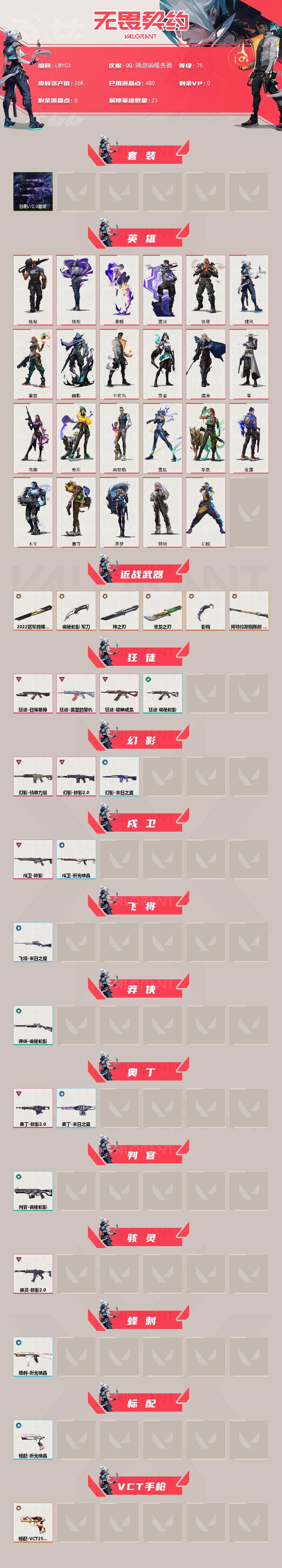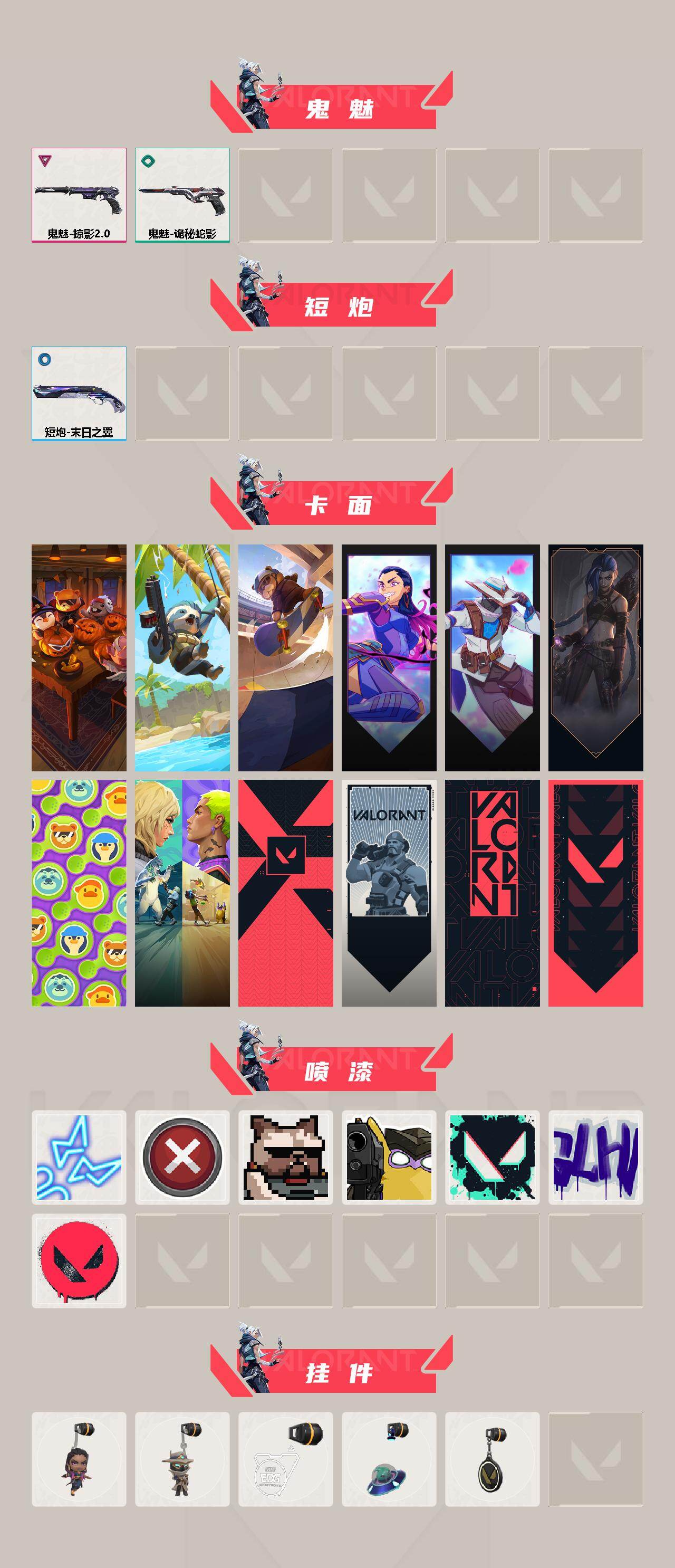 [16361973]【套装】:掠影//2.0套装 【英雄】:幻棱,炼狱,维斯,暮蝶,壹决,铁臂,捷风,雷兹,幽影,不死鸟,贤者,猎枭,零,芮娜,奇乐,尚勃勒,霓虹,斯凯,夜露,k/o,盖可,黑梦,钢锁 【近战武器】:近战武器-2022全球冠军赛 蝴蝶刀,近战武器-影钩,近战武器-5周年//公测重制版 苍龙之刃,近战武器-神之刃,近战武器-诡秘蛇影 军刀,近战武器-阿特拉斯指挥部 甩棍 【狂徒】:狂徒-盖亚的复仇,狂徒-日冕雄师,狂徒-耀鳞威龙,狂徒-诡秘蛇影 【幻影】:幻影-侦察力量,幻影-掠影//2.0,幻影-末日之翼 【戍卫】:戍卫-掠影,戍卫-折光棱晶 【飞将】:飞将-末日之翼 【莽侠】:莽侠-诡秘蛇影 【奥丁】:奥丁-掠影//2.0,奥丁-末日之翼 【判官】:判官-诡秘蛇影 【骇灵】:骇灵-掠影//2.0 【蜂刺】:蜂刺-折光棱晶 【标配】:标配-折光棱晶 【vct手呛】:标配-vct25 x edg 【鬼魅】:鬼魅-掠影//2.0,鬼魅-诡秘蛇影 【短炮】:短炮-末日之翼 【卡面】:南瓜盛典 卡面,树懒大作战 卡面,clutch 卡面,无畏契约go!第一卷:芮娜 卡面,无畏契约go!第一卷:零 卡面,《双城之战》金克丝 卡面,战术小伙伴 卡面,钢锁vs盖可 卡面,代号红色 卡面,新兵报到 卡面,v契约 卡面,无畏契约 卡面 【喷漆】:霓光四射 喷漆,买装还是存钱 喷漆,关门放狗 喷漆,放下武器 喷漆,胜利属于无畏契约 喷漆,glhf 喷漆,无畏契约 喷漆 【挂饰】:无畏契约go!第一卷 芮娜 挂饰,无畏契约go!第一卷 零 挂饰,vct x edg 挂饰,天外飞客 挂饰,无畏契约 纪念币 挂饰