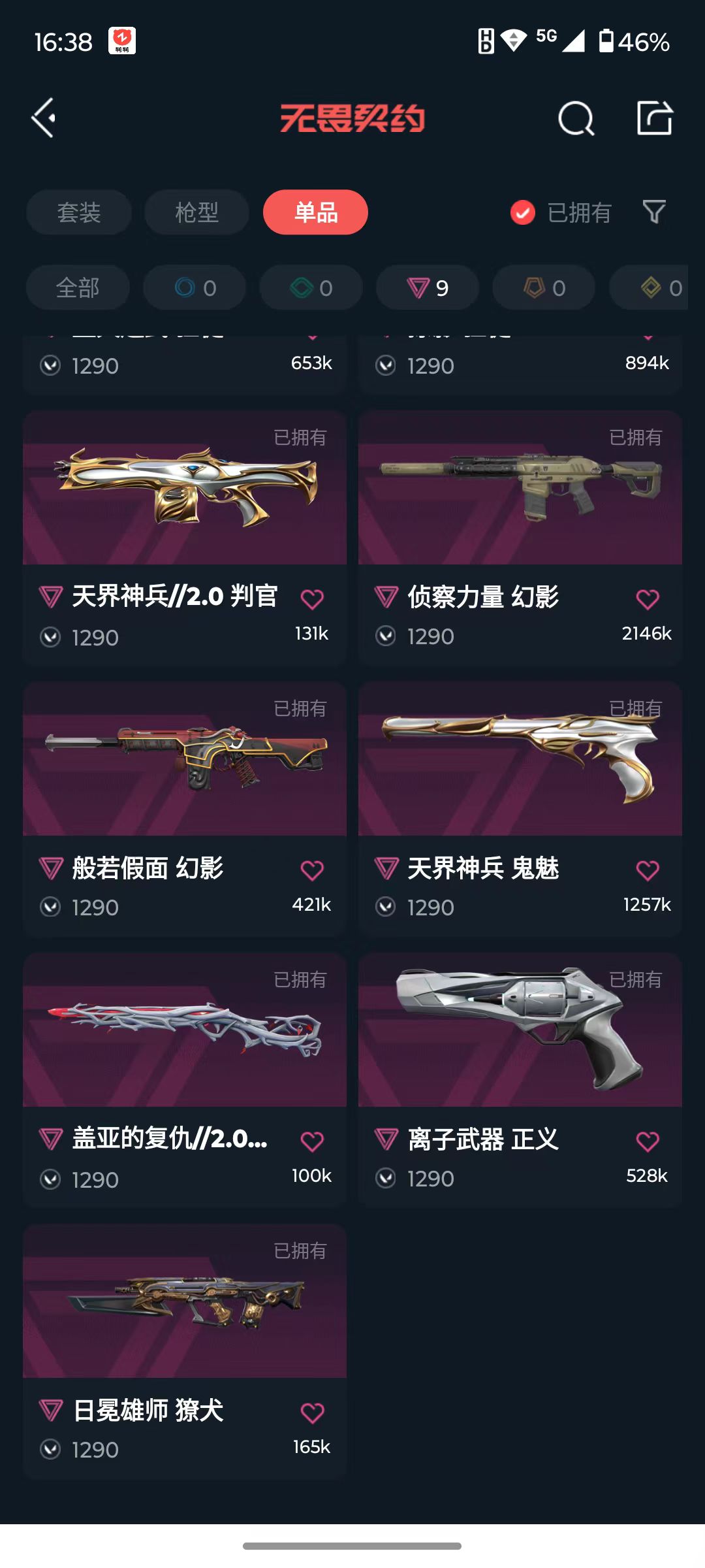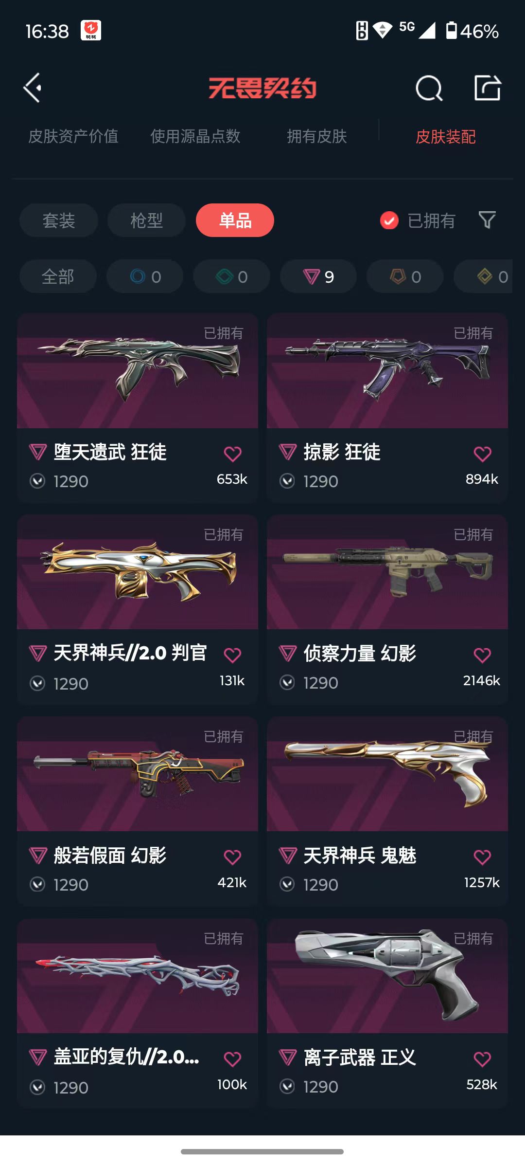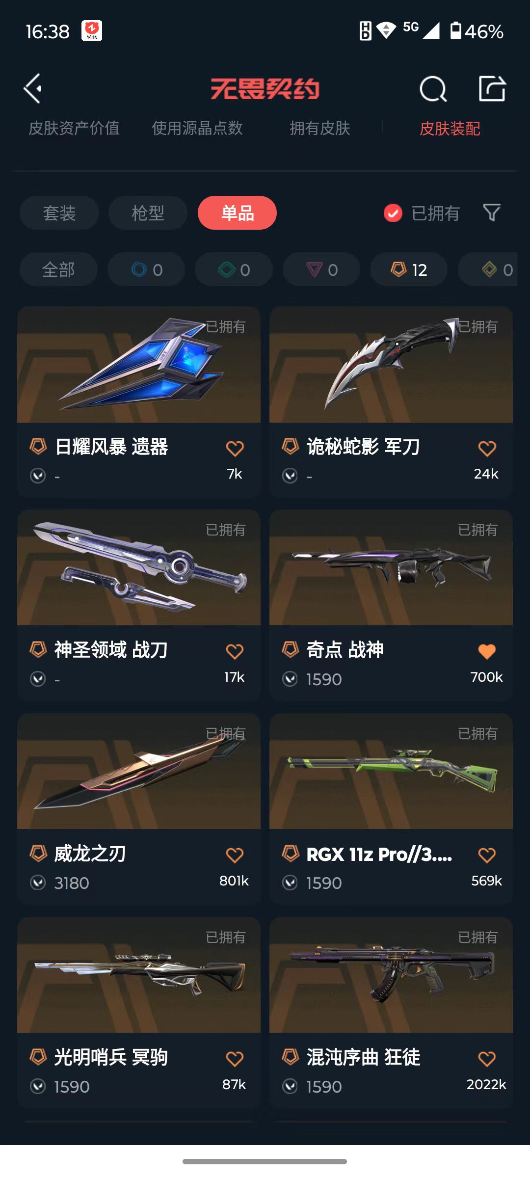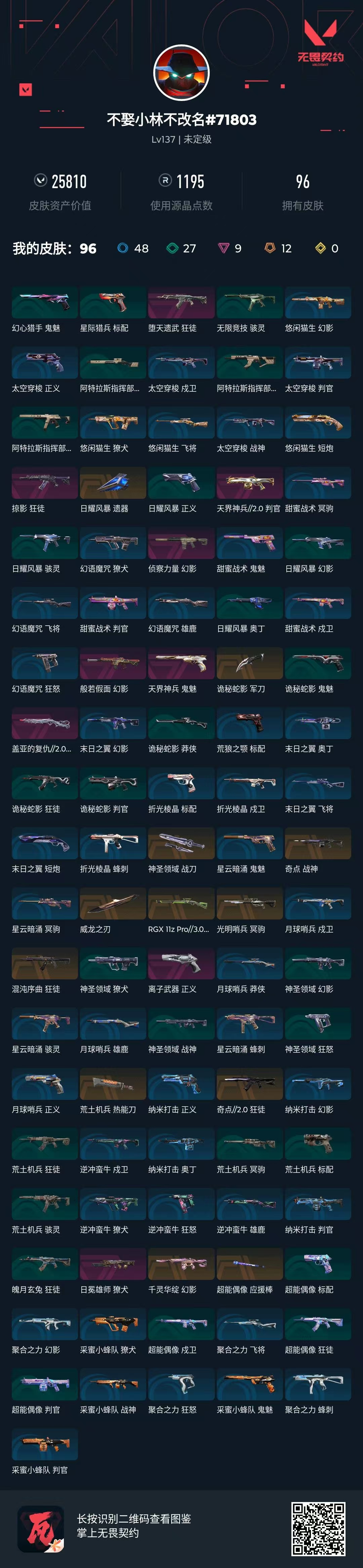[16366769]q193089 无畏契约/等级137/段位未定级/英雄28/皮肤96/资产25810/已使用r点1195/剩余r点180/日耀风暴-遗器,诡秘蛇影-军刀,神圣领域-战刀,荒土机兵-热能刀,超能偶像-应援棒,威龙之刃,混沌序曲-狂徒,千灵华绽-幻影,奇点//2.0-狂徒,堕天遗武-狂徒,侦察力量-幻影,般若假面-幻影,日冕雄师-獠犬,掠影-狂徒,光明哨兵-冥驹,rgx-11z-pro//3.0-莽侠,奇点-战神,天界神兵//2.0-判官,盖亚的复仇//2.0-雄鹿,天界神兵-鬼魅,离子武器-正义
